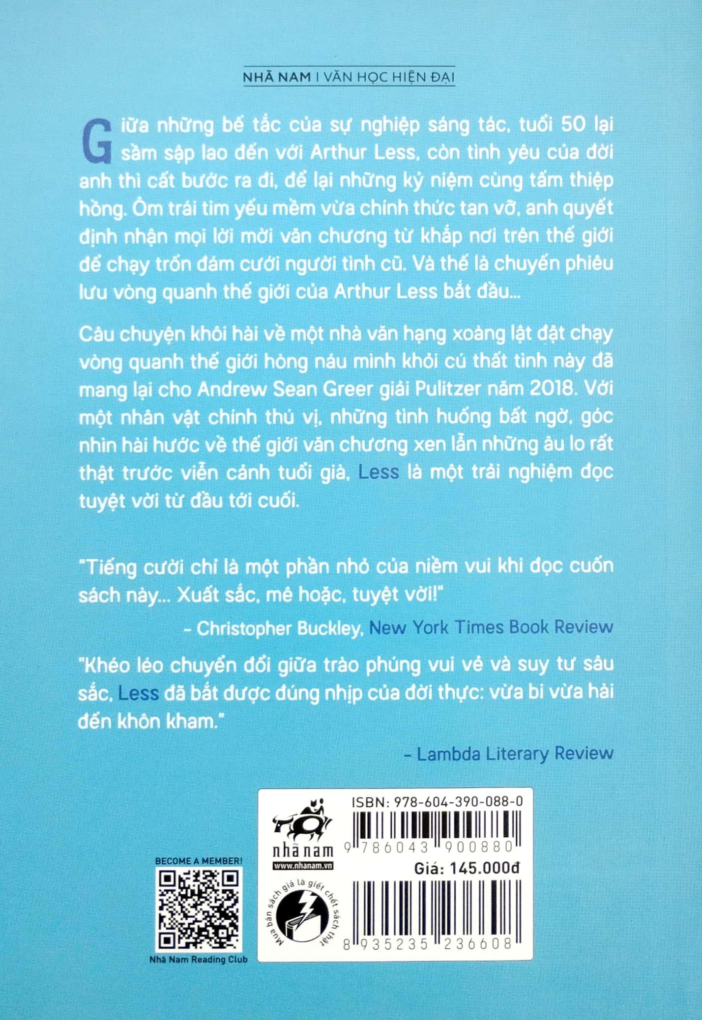 Câu chuyện khôi hài về một nhà văn hạng xoàng lật đặt chạy vòng quanh thế giới hòng náu mình khỏi cú thất tình này đã mang lại cho Andrew Sean Greer giải Pulitzer năm 2018. Với một nhân vật chính thú vị, những tình huống bất ngờ, góc nhìn hài hước về thế giới văn chương xen lẫn những âu lo rất thật trước viễn cảnh tuổi già, Less là một trải nghiệm đọc tuyệt vời từ đầu tới cuối.