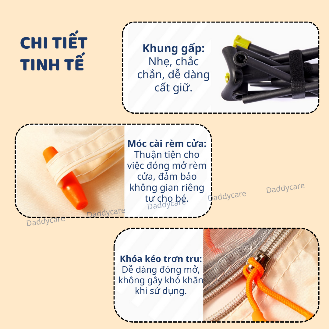 - CHI TIẾT TINH TẾ Khung gấp: Nhẹ, chắc chắn, dễ dàng cất giữ. Móc cài rèm cửa: Thuận tiện cho việc đóng mở rèm cửa, đảm bảo không gian riêng tư cho bé. Khóa kéo trơn tru: Dễ dàng đóng mở, không gây khó khăn khi sử dụng. **ƯU ĐIỂM VƯỢT TRỘI CỦA THẢM DÃ NGOẠI MIDEER: