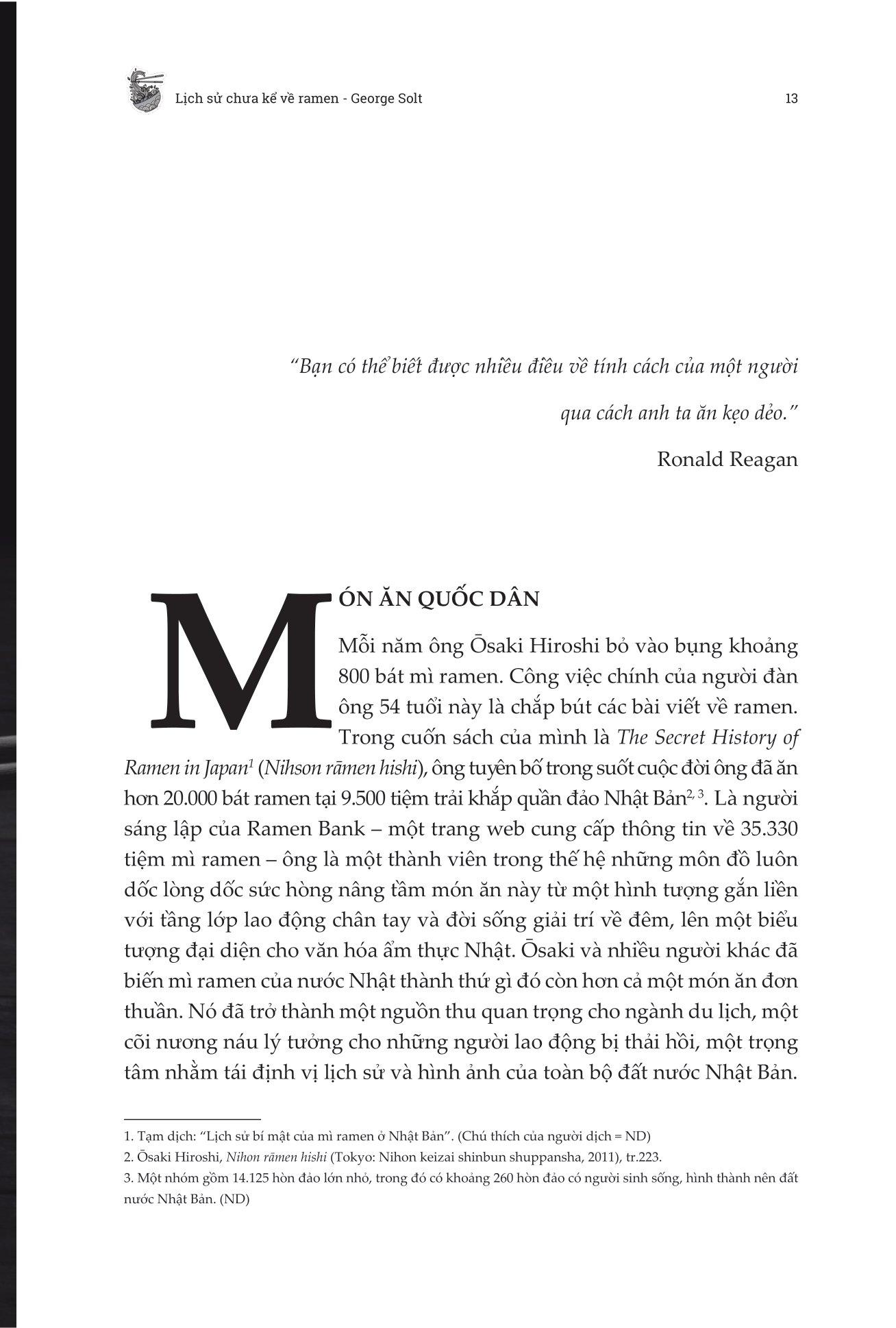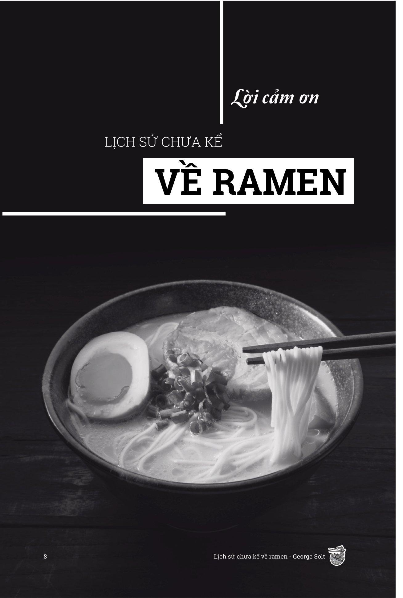 Vượt ra khỏi những bát nước dùng và sợi mì thơm ngon, George Solt đã kể lại cuộc hành trình biến đổi của mì ramen từ nguồn gốc khiêm tốn ở Trung Quốc cho đến một thương hiệu toàn cầu đại diện cho ẩm thực Nhật Bản trong Lịch Sử Chưa Kể Về Ramen - Biến Động Chính Trị Tại Nhật Bản Đã Tạo Ra Một Kỳ Tích Ẩm Thực Toàn Cầu Như Thế Nào?. Đây không chỉ là lịch sử của một món ăn được yêu thích, cuốn sách phản ánh quá trình tái thiết sau chiến tranh của Nhật Bản, những điều kỳ diệu về kinh tế và nhịp đập của xã hội Nhật Bản. George Solt đã mang đến một hành trình toàn diện và khai sáng vào thế giới ramen, giúp độc giả đánh giá lại món mì nổi tiếng với một sự tôn trọng mới dành cho lịch sử phong phú của nó.