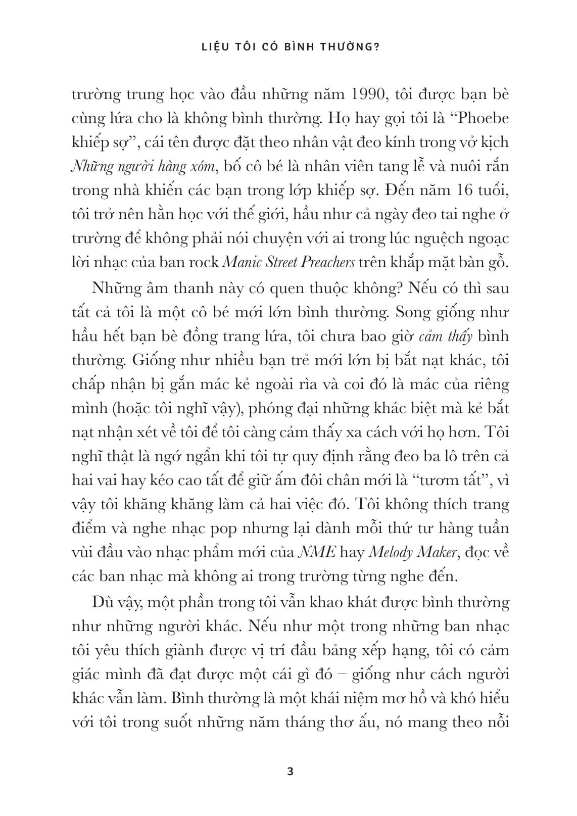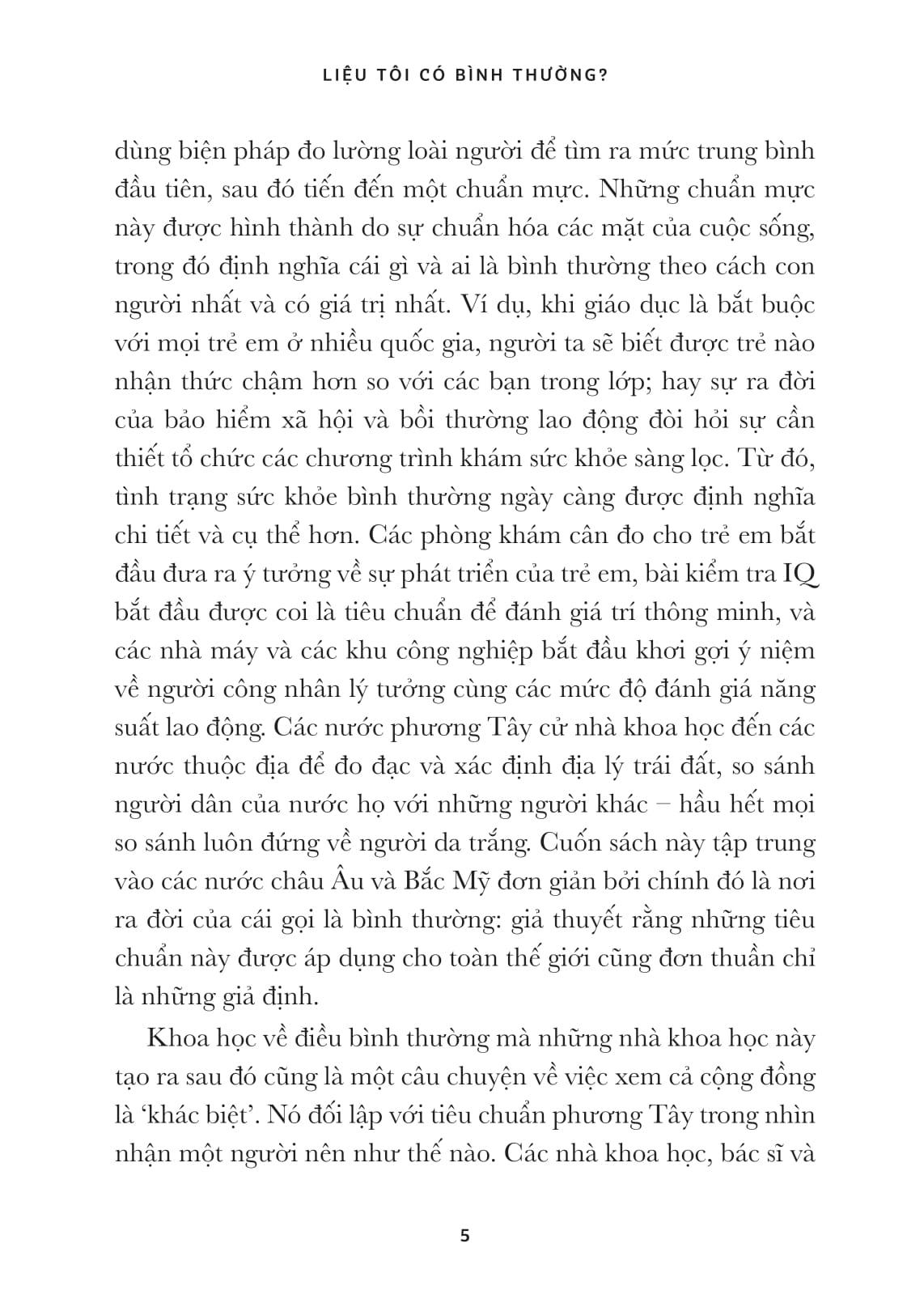 Các vấn đề đặt ra trong sách đều thú vị, đi từ giải thích thuật ngữ "bình thường" từ cổ chí kim đến các băn khoăn liệu cơ thể m.ình có bình thường? Tâm trí, đời sống tình dục, cảm xúc... của m.ình có bình thường chăng? Con của m.ình có bình thường, có giống hay bằng “con nhà người ta” không? Cả xã hội này có bình thường?
