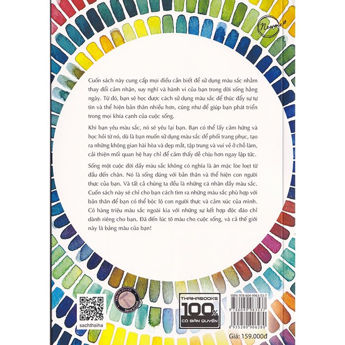 Vì vậy nếu bạn sẵn sàng sử dụng sức mạnh của màu sắc để học về bản thân mình thì hãy đọc cuốn sách này. Cuốn sách sẽ chỉ cho bạn cách tìm ra những màu sắc phù hợp với bản thân, bất kể đó là màu sắc nào, để bạn có thể bộc lộ con người thực và cảm xúc của mình. Có hàng triệu màu sắc ngoài kia với những sự kết hợp độc đáo chỉ dành riêng cho bạn. Đã đến lúc tô màu cho cuộc sống rồi, và cả thế giới này là bảng màu của bạn!