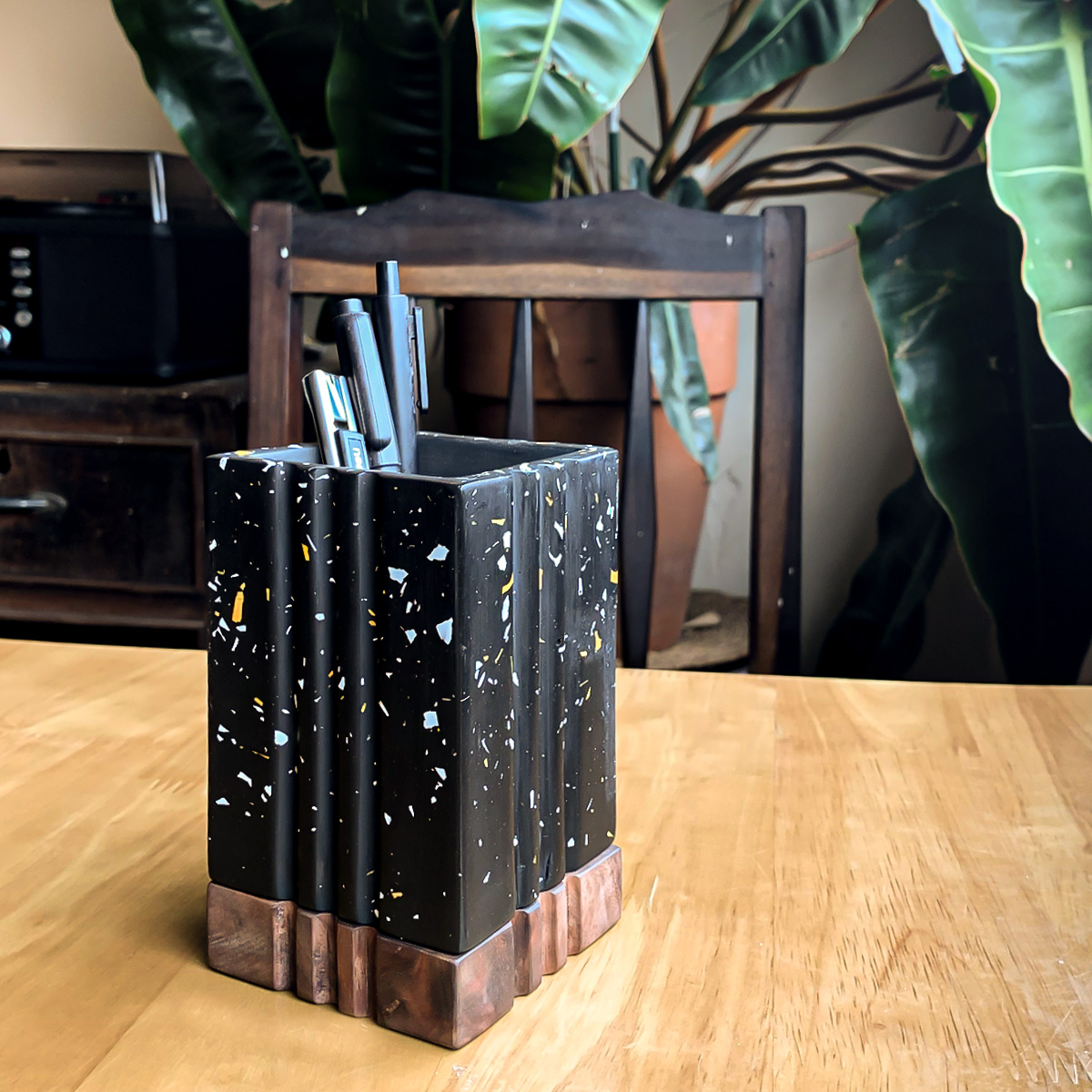 *Mô tả: Lọ Bút Jesmonite Brick có cấu tạo độc đáo gồm hai tầng xếp chồng lên nhau: khay jesmonite lớn để cắm bút viết và khay gỗ óc chó bên dưới đựng các vật dụng văn phòng nhỏ như kẹp giấy, gôm tẩy và giấy ghi chú. Với thiết kế vừa cổ điển vừa hiện đại nhờ sự hòa quyện tinh xảo giữa hai chất liệu thân thiện với môi trường, lọ bút đa năng dễ dàng phối hợp với nhiều phong cách nội thất khác nhau. Sản phẩm là món quà hữu ích, mới lạ tặng cho người thân, bạn bè, sếp và đồng nghiệp trong các dịp: tiệc mừng tân gia, sinh nhật, thăng chức,