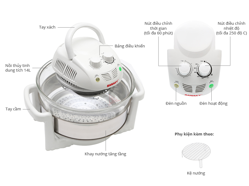 ·Nguồn điện: 220-240V/50-60Hz; ·Bộ chỉnh nhiệt độ: 00C -2500C; . Bộ định thời gian : 0'-60' ·Bộ vi mạch điều chỉnh nhiệt tự động giúp tiết kiệm điện. ·Khoang lò bằng thủy tinh chịu nhiệt