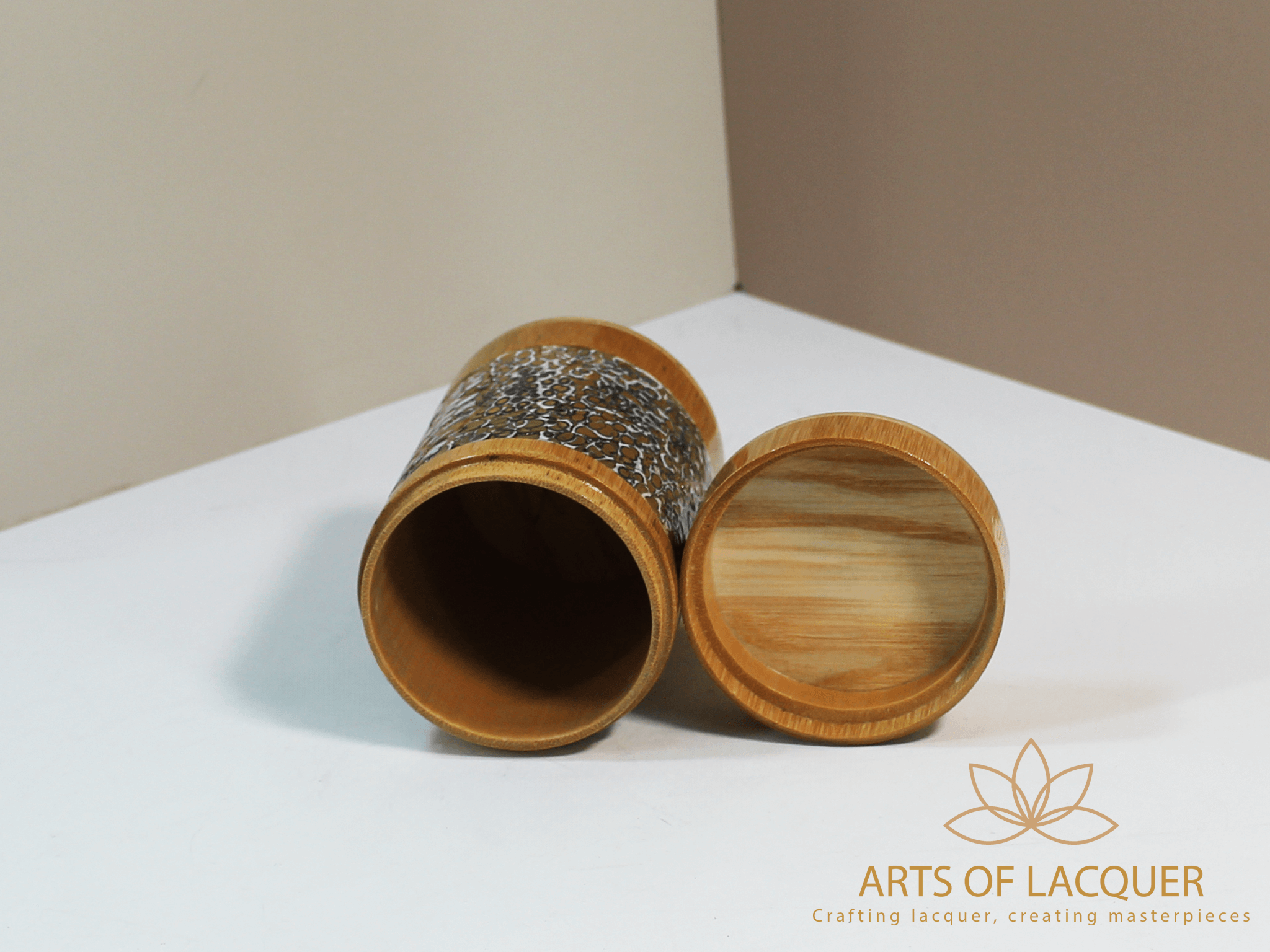 Sản phẩm trong hình là "Lọ Tre Sơn Mài Khảm Trai Xanh Biển" từ Arts of Lacquer. Hộp có thiết kế tròn với nền màu vàng nhạt, được trang trí bằng hoa văn tinh xảo