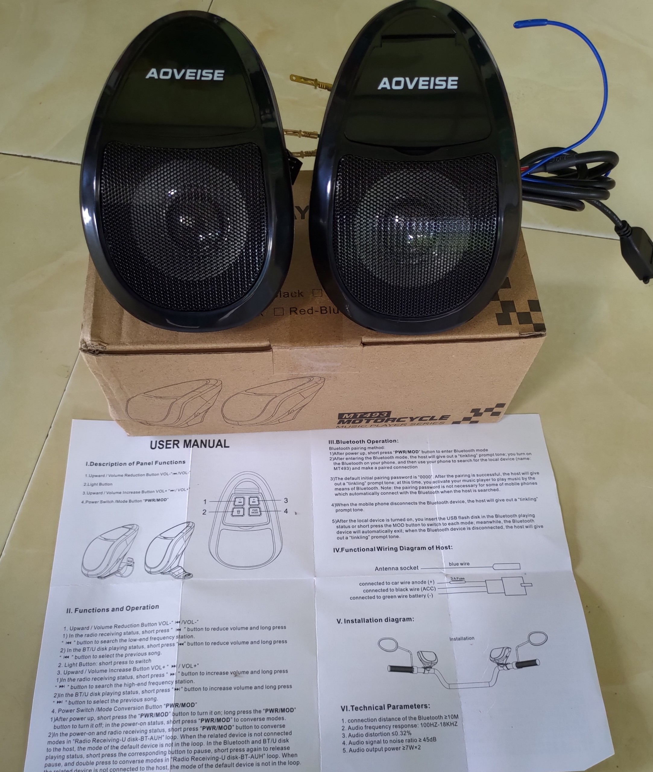 LOA AOVEISE MT493 các anh shipo , các bạn phượt thủ, các bạn hay lưu thông ngoài đường cần những giây phút giải trí. không thể bỏ qua cập loa bluetooth AOVEISE MT493 cực kỳ chất lượng này. với đầy đủ tính năng như chống nước chống bụi ip66. loa AOVEISE MT493 có thiết kế rất đẹp sang trọng và dễ sử dụng. giúp nguòi dùng thoải mái với mọi thao tác khi đi xe. loa AOVEISE MT493 cũng có tích hợp cập đèn demi ánh sáng xanh cực kỳ đẹp. loa AOVEISE MT493 được thiết kế cho không gian mở nên nghoài trời khi đang di chuyển người dùng vẫn cảm nhận được trọn âm thanh cực kỳ âm và trong. SẢN PHẨM BÊN SHOP BẢO HANH 12 THANG, ae hoàn toàn yên tâm sử dụng shop cam kết sản phẩm như hình ảnh video và mô tả. việc lắp đặt và sử dụng thiết bị cực kỳ đơn gian , nếu các bạn co cần hỗ trợ gì xin lh trực tiếp để shop được hỗ trợ các bạn nhé,. LƯU Ý SẢN PHẨM SỬ DỤNG ĐIỆN 12V NHÉ; chi tiết sản phẩm; Thông số kỹ thuật: Thương hiệu: AOVEISE Mẫu số: MT493 Mô hình áp dụng: Thích hợp cho xe máy với khẩu độ 10 mm gương Màu: Tất cả màu đen Kích thước: 120 x 85 x 70 mm/4,72 x 3,35 x 2,76 inch Trọng lượng: 660 g công xuất ; 15w x 2 Sử dụng: Chơi nhạc nghe FM Bao gồm: 1 x cặp loa xe máy 1x bộ pas gắn chân gương 1 x Hướng dẫn sử dụng Sản phẩm này là tài sản cá nhân được bán bởi Nhà Bán Hàng Cá Nhân và không thuộc đối tượng phải chịu thuế GTGT. Do đó hoá đơn VAT không được cung cấp trong trường hợp này.