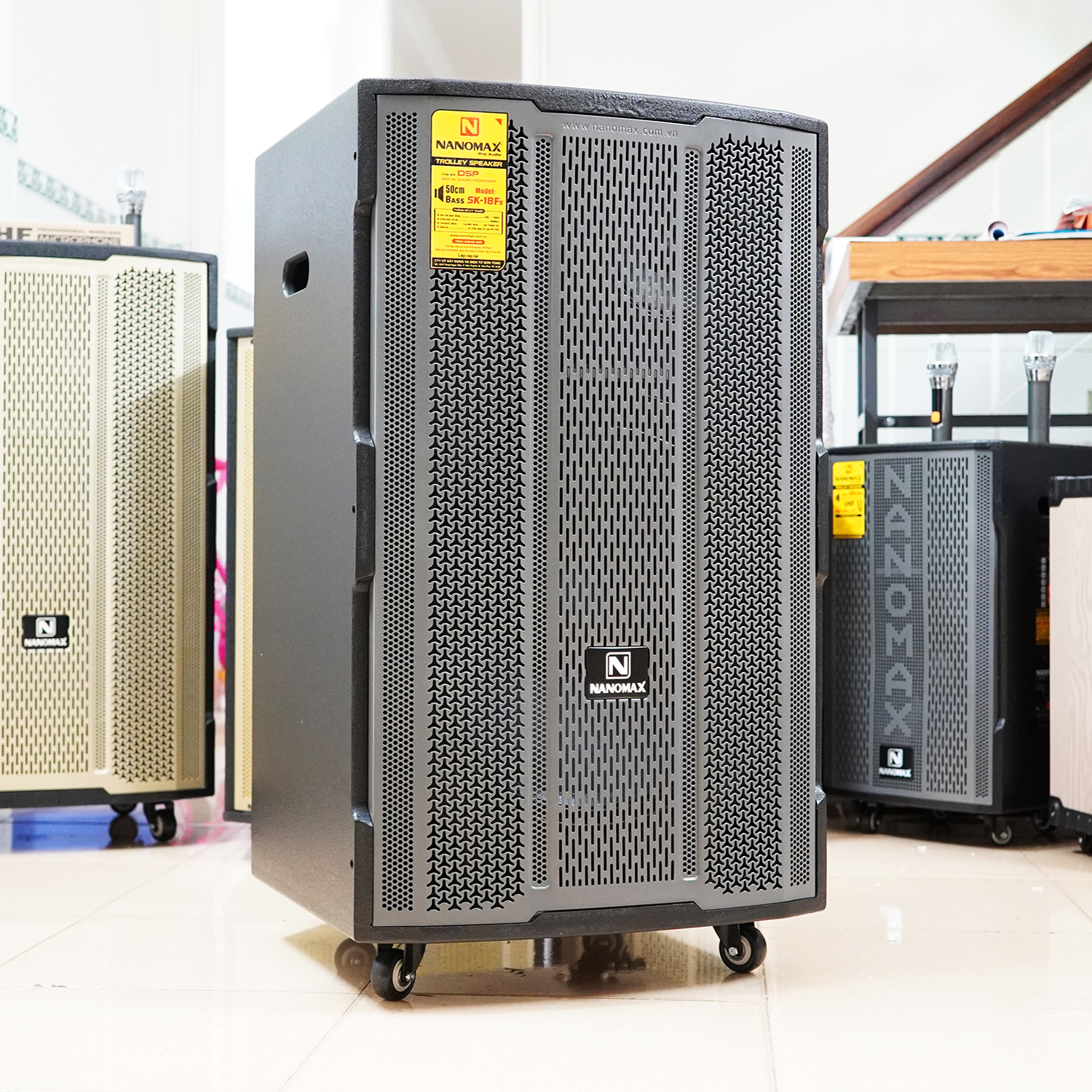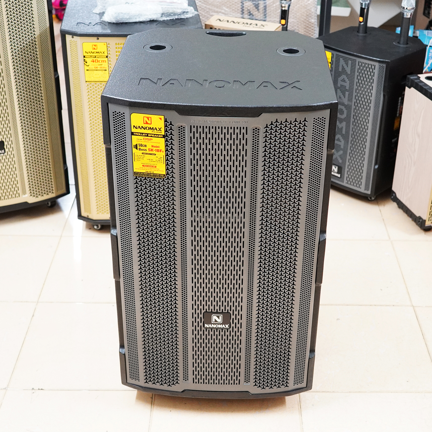 Cuối cùng, loa kẹo kéo Nanomax SK-18F5 có ngoại hình hầm hố 51x53x89cm thực sự rất lớn ngang con loa 6 tấc, loa Bass đập khỏe mạnh, khi cần có thể chỉnh thành chất âm ấm; loa Treble vang xa, kết hợp loa Mid tạo ra âm thanh có chất lượng vượt trội, đi rất xa, nên chỉ những không gian rộng thoáng mới đủ để em nó thể hiện bản lĩnh của mình.