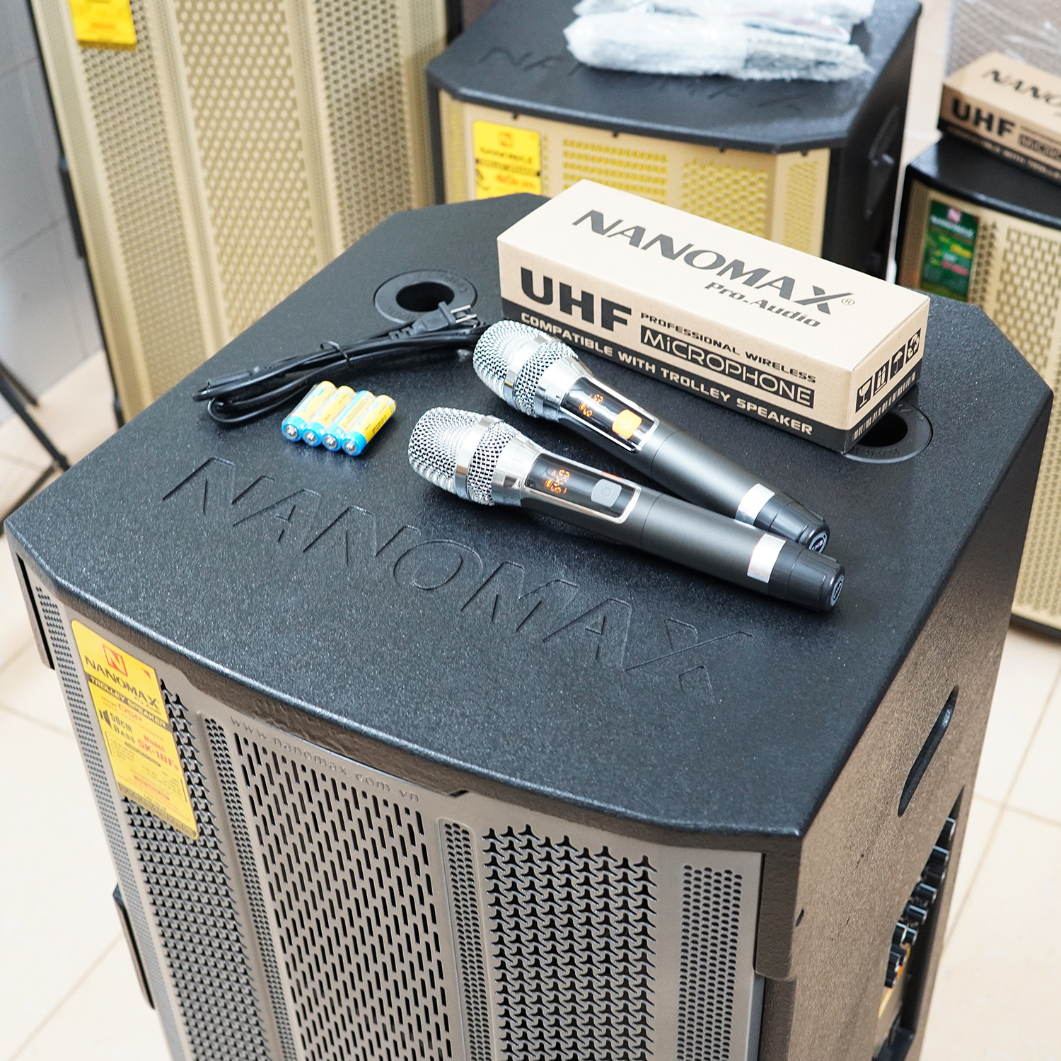 Loa kéo công suất 850W, Kích Thước: 81.5 x 51.5 x 45.2 cm Hỗ trợ kết nối Bluetooth, thẻ SD, USB Tích hợp 2 micro không dây, sóng UHF, thân micro bằng kim loại. chức năng