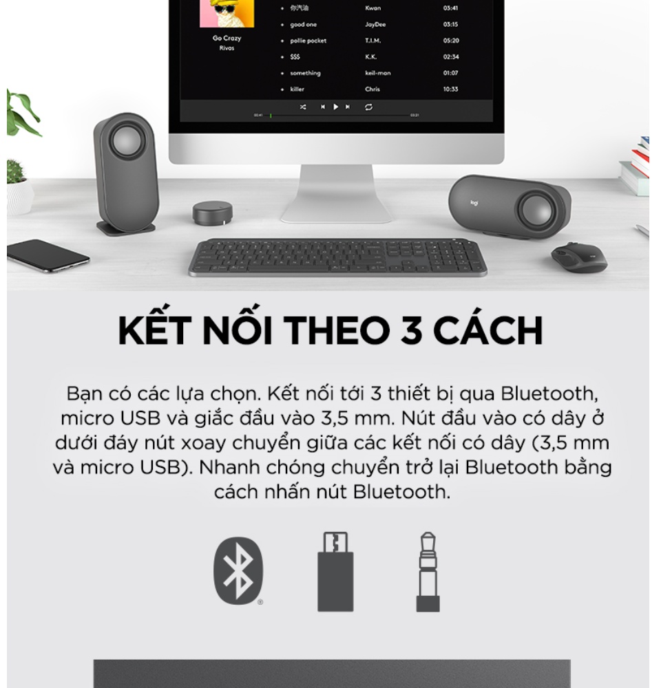 Các vệ tinh hình bầu dục trong Z407 được sơn màu xám than chì và có thể hoạt động theo cả chiều dọc và chiều ngang. Nhờ tính năng này và sự nhỏ gọn, chúng dễ dàng nằm gọn dưới màn hình, tiết kiệm không gian trống trên màn hình. Và một số phương thức kết nối, bao gồm Bluetooth 5.0, USB và giắc cắm 3,5 mm, cho phép bạn sử dụng Z407 để xem phim, nghe nhạc và chơi các trò chơi yêu thích không chỉ trên PC mà còn trên điện thoại thông minh hoặc máy tính bảng của bạn.