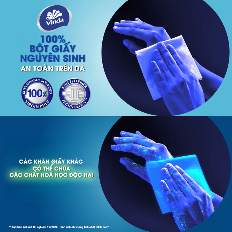 Khăn giấy rút Vinda được làm từ bột giấy nguyên chất, không chứa hóa chất tẩy trắng độc hại, an toàn cho sức khỏe người dùng. Sản phẩm Vinda bền dai ngay cả khi ướt, không để lại vụn giấy khi sử dụng