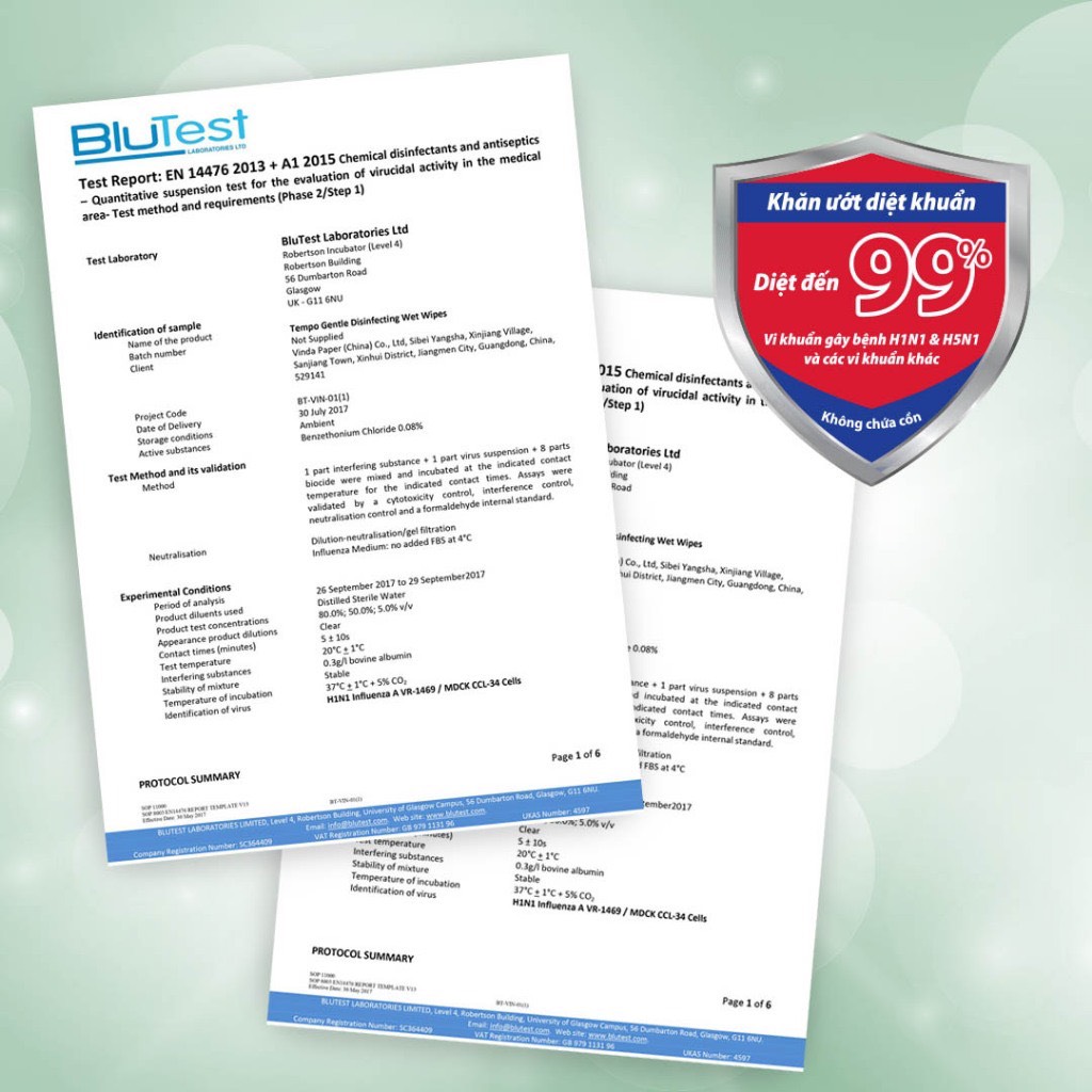 Khăn giấy ướt Mini cao cấpTempo với tính năng diệt khuẩn đến 99%, vi khuẩn gây bệnh H5N1 và H1N1 và các loại vi khuẩn khác, được sản xuất theo công nghệ tiên tiến và