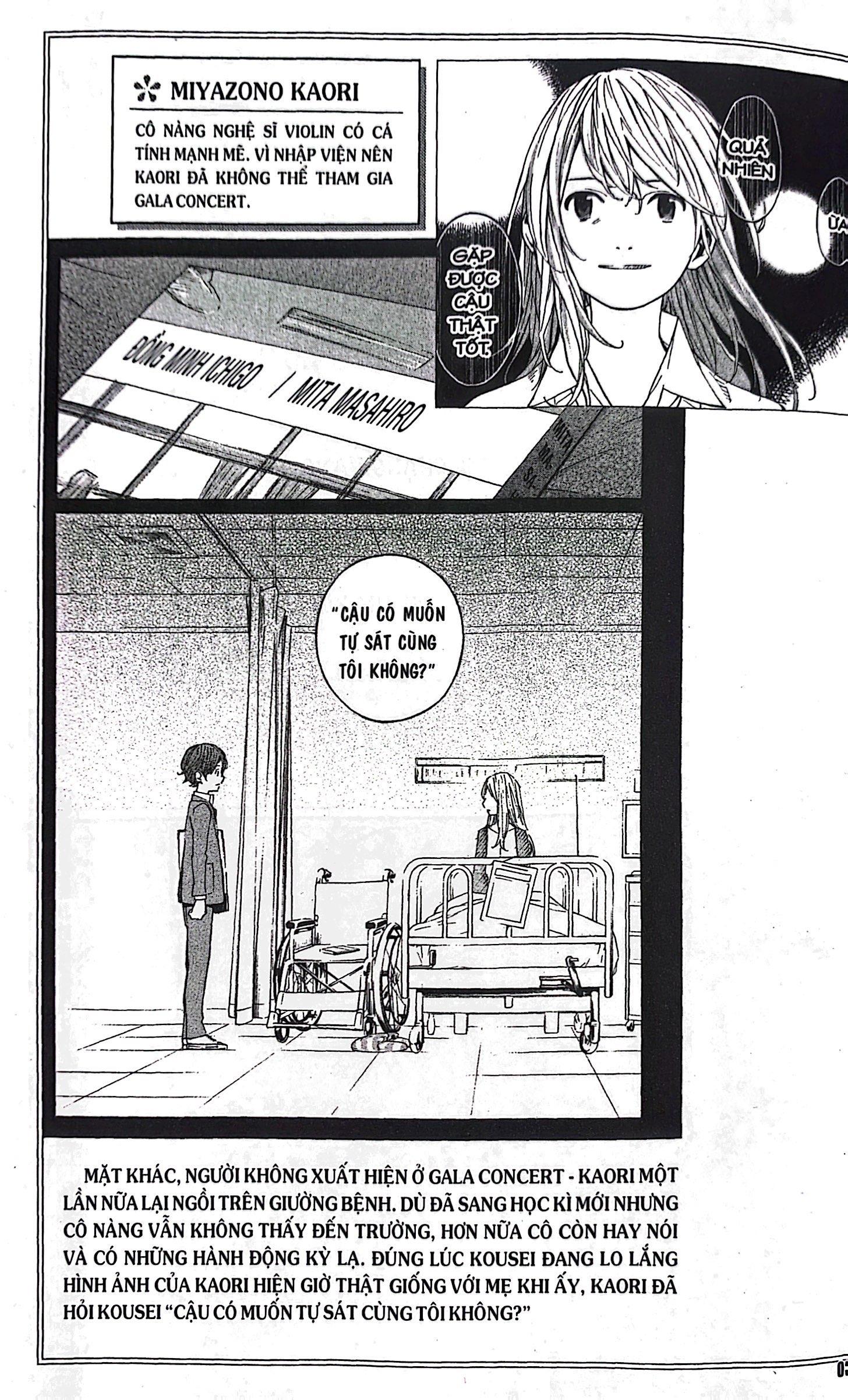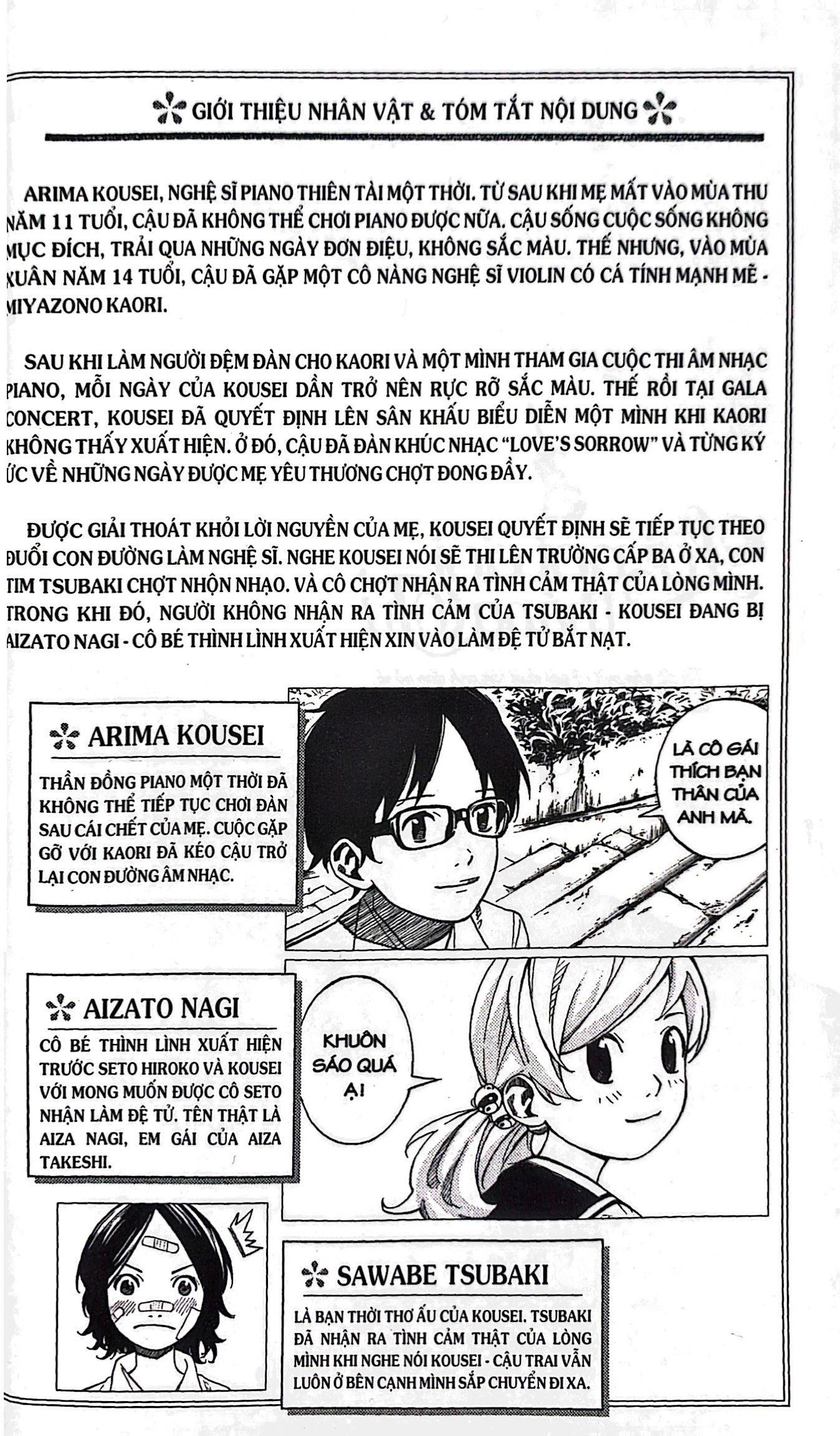 Arima Kousei, thần đồng Piano một thời đã không thể chơi đàn được nữa sau cái chết của mẹ. Cậu trải qua những ngày đơn điệu, sống cuộc sống không có mục đích. Cho đến một ngày nọ vào mùa xuân, cậu đã gặp một cô gái dưới tán hoa anh đào đang nở rộ. Cô ấy rất bạo lực, tính khí thì thất thườ nhưng cô ấy cũng chính là người đã thay đổi cả thế giới tẻ nhạt của cậu! Cuộc hội ngộ ấy đã mang đến cho cậu động lực và cơ hội để thoát khỏi nỗi ám ảnh trong quá khứ như thế nào? "Hình phạt" mà cậu phải chịu, phần tâm hồn vẫn luôn sợ hãi, vẫn luôn đấu tranh của cậu sẽ ra sao? Những mâu thuẫn liệu có được giải quyết? Đón đọc Lời nói dối tháng Tư - một câu chuyện về tình bạn, tình yêu, về tình mẹ con, tình đối thủ, một câu chuyện về tuổi trẻ, về cuộc sống.