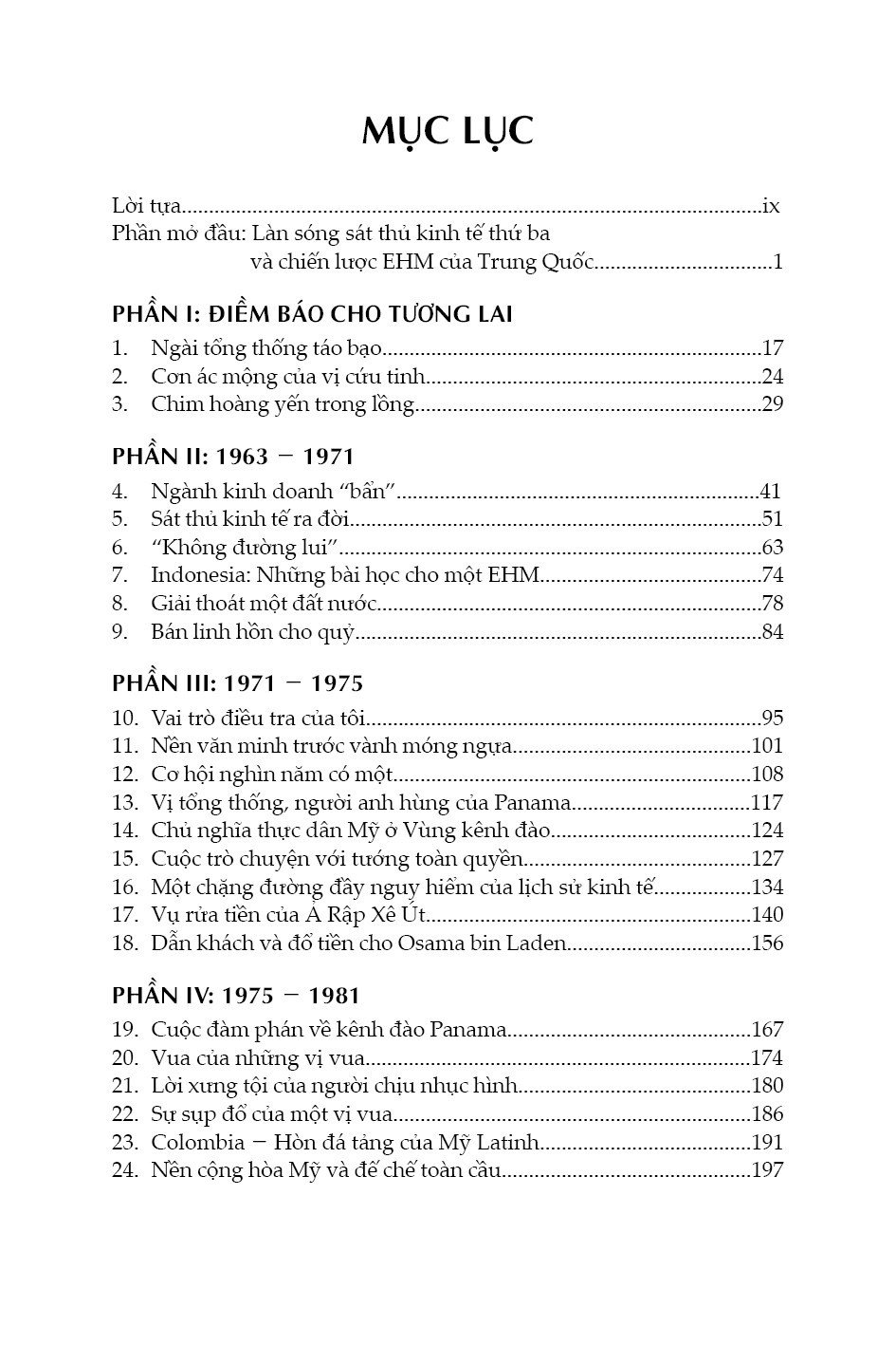 Trong hai ấn phẩm trước, John Perkins đã tiết lộ những vụ tham nhũng và mưu đồ quốc tế đã và đang biến nền cộng hòa Hoa Kỳ thành một đế chế toàn cầu. Trong ấn bản thứ 3 này, cựu EHM John Perkins sẽ tiếp tục quá trình đó bằng cách mô tả những sửa đổi nguy hiểm có tính hiệu quả cao của Trung Quốc đối với chiến lược EHM và đưa ra một kế hoạch để chuyển đổi một nền kinh tế chết, suy thoái thành một nền kinh tế sống, tái sinh thành công. Ông đã cập nhật và bổ sung thêm 12 chương mới bùng nổ trình bày chi tiết về sức hấp dẫn, sự bóc lột và sự tàn phá của chiến lược EHM của Trung Quốc ở Mỹ Latinh, châu Á, châu Phi, Trung Đông, thậm chí là cả châu Âu.
