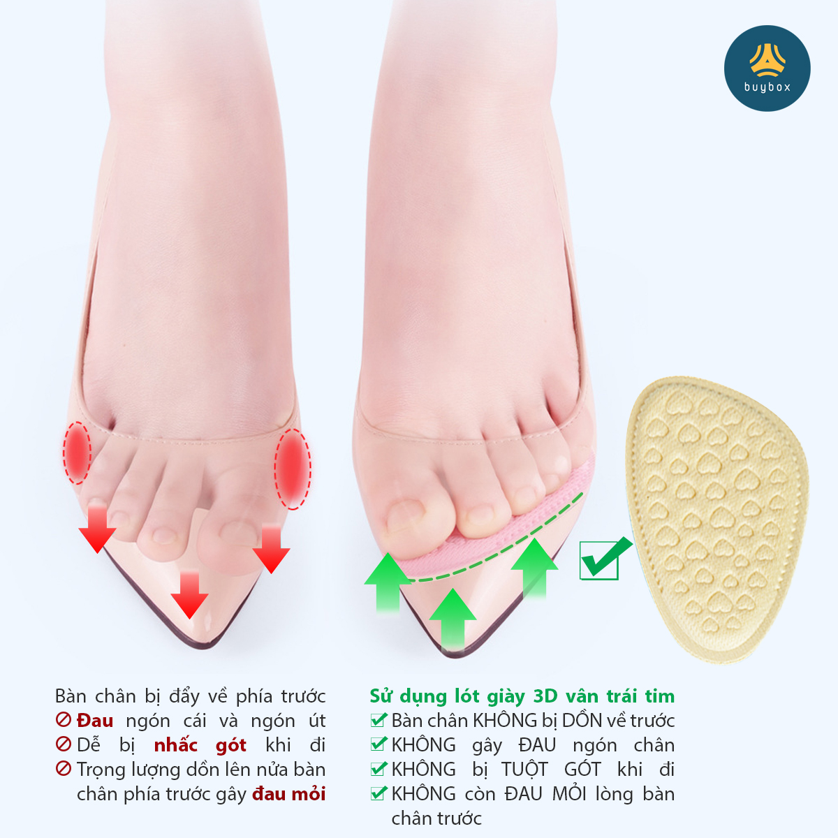- Đi lâu ngày lót theo giày bị lún làm cho phần bàn chân bị hai sần. Từ nay không còn phải lo lắng nữa vì đã có Lót giày cao gót chống trượt bàn chân về phía mũi và đệm êm gang bàn chân - buybox - BBPK161 siêu êm chân và thoải mái CÔNG DỤNG NỔI BẬT