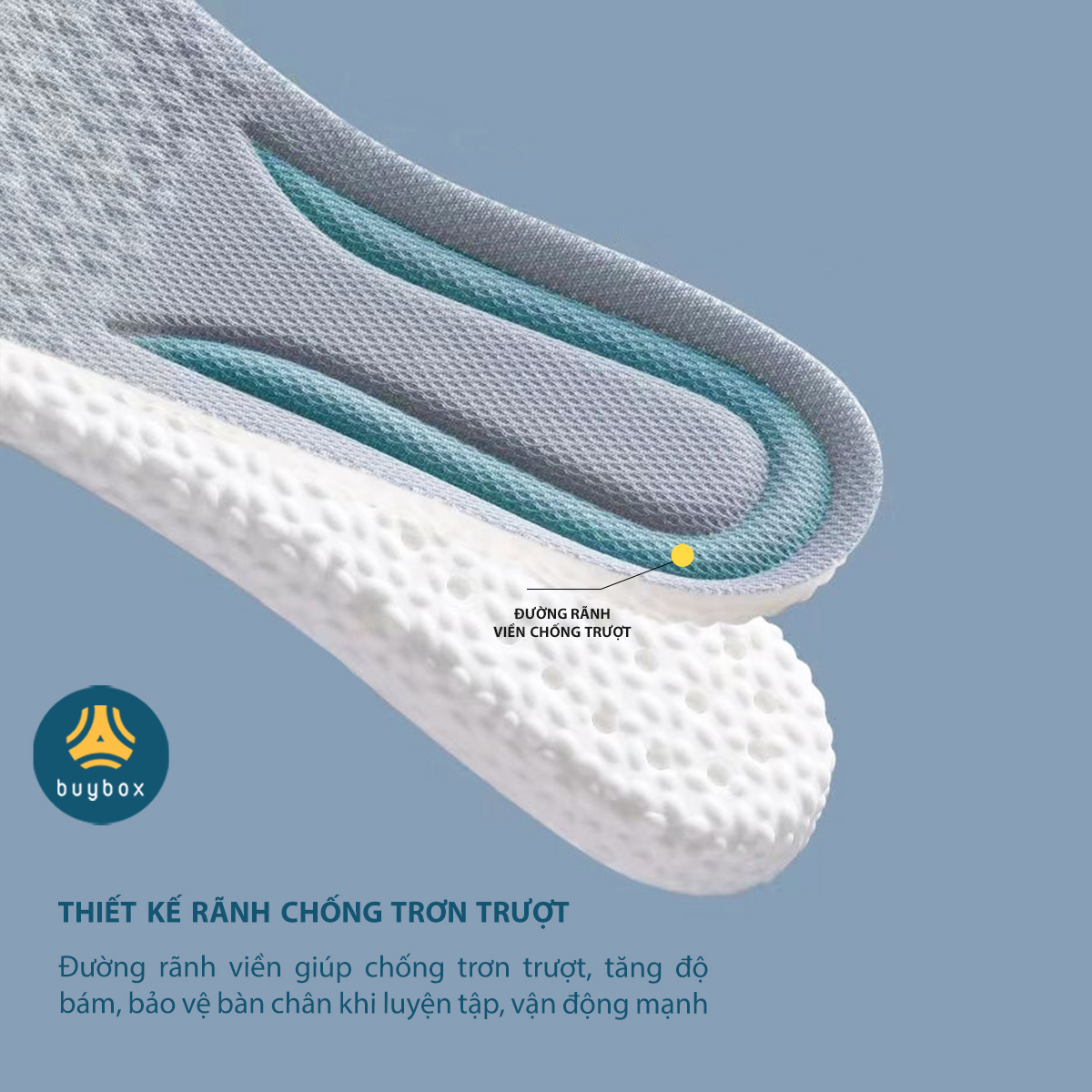 Bề mặt lót giày được dập các vân nổi, giúp giảm trơn trượt, massage cho bàn chân