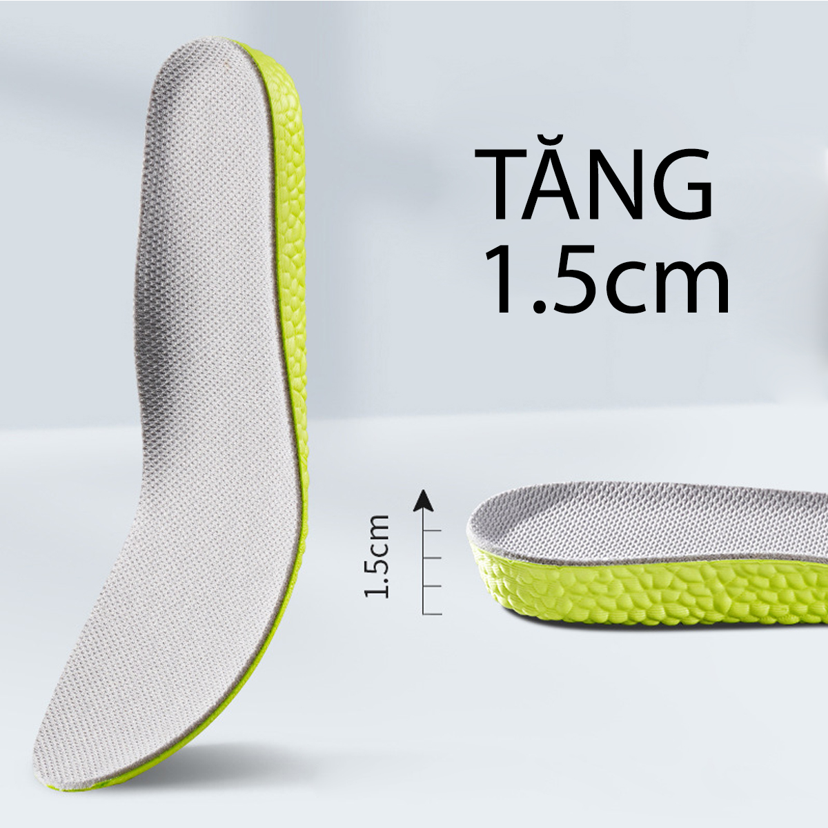 VÌ SAO PHẢI CẦN TĂNG CHIỀU CAO??? Tăng chiều cao để vóc dáng đẹp hơn Tăng chiều cao để dáng đi thêm kiêu hãnh Tăng chiều cao để thêm tự tin Tăng chiều cao để không bị chê lùn Tăng chiều cao đơn giản là vì thích         CÔNG DỤNG NỔI BẬT Lót giày tăng chiều cao có 3 lựa chọn tăng chiều cao 1.5cm/2.5cm/ 3.5 cm Bề mặt vải lưới cotton thoáng khí Thiết kế vòm chữ U ôm chân, giữ cố định từ gót đến đầu gối Công nghệ đệm lò xò trợ lực cho bàn chân Đế bỏng ngô chống trượt, đàn hồi cực tốt Lót giày siêu nhẹ không ảnh hưởng đến việc di chuyển Cấu tạo 3 lớp: bề mặt vải lưới cotton thoáng khí, mút bông cao cấp và đế đàn hồi chống lún, đệm êm bàn chân Sản phẩm có thể giặt sạch bằng xà phòng nhẹ và tái sử dụng nhiều lần, dễ tháo lấp để dùng cho nhiều đôi giày khác nhau Mặt dưới miếng lót được kẻ sẵn size, dùng kéo cắt theo các đường cong này để có được kích thước cần sử dụng. Lót giày độn đế sử dụng được cho nhiều loại giày cổ cao như: giày sneaker thể thao, giày tây, giày mọi, giày boot,   NGỮ CẢNH SỬ DỤNG Tăng chiều cao lén không bị phát hiện Nâng đỡ gang bàn chân đem đến cảm giác êm chân Lót giày độn đế dành cho người bị đau thốn gót do đế giày cứng và miếng lót của giày quá mỏng Lót giày dành cho người bị chân cao chân thấp cải thiện dáng đi Giữ cho bàn chân không bị ẩm ướt và giảm mùi hôi giày Lót êm để đi bộ được lâu, thoải mái THÔNG TIN SẢN PHẨM Quy cách: 1 cặp 2 miếng dùng cho 1 đôi giày Chất liệu: hạt silicone, PU, vải cotton Kích thước: 1.5cm, 2.5cm, 3.5cm Size: 35-36, 37-38, 39-40,41-42,43-44 Màu sắc: xám xanh   HƯỚNG DẪN SỬ DỤNG