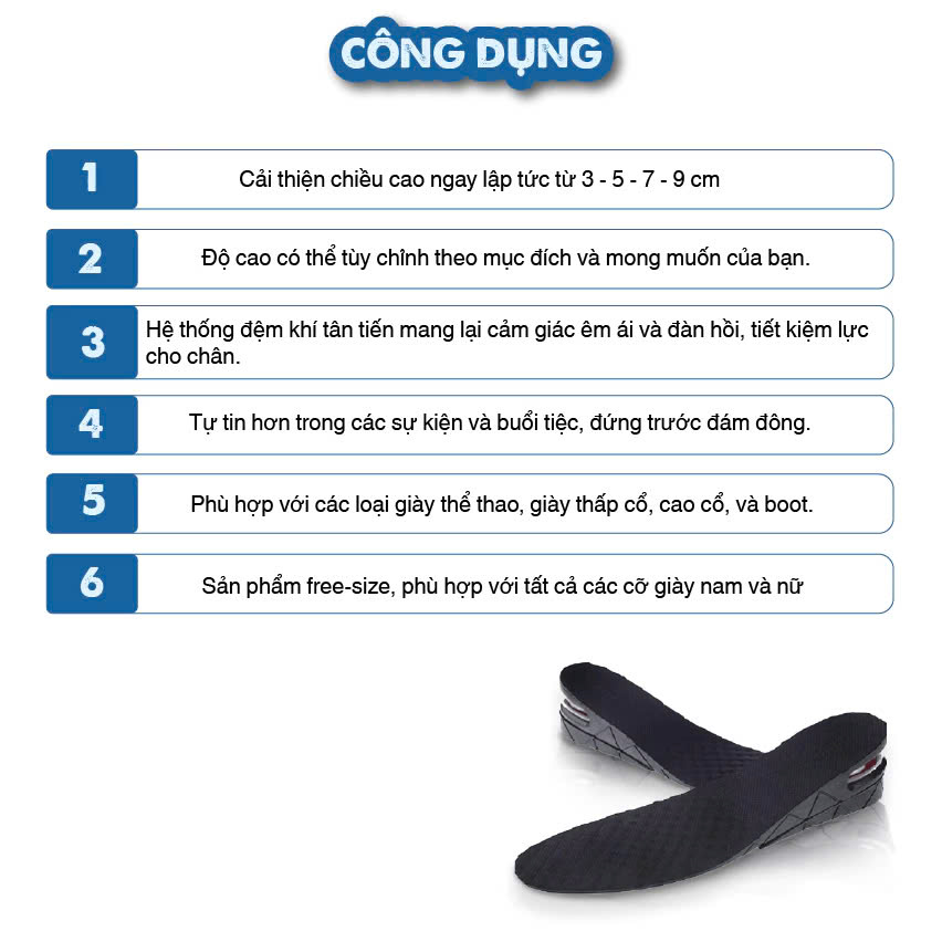 *** TÊN SẢN PHẨM: TÊN SẢN PHẨM: 02 Miếng Lót Giày Độn Đế Tăng Chiều Cao (Loại 3cm,4,5cm, 7cm Đệm Khí) ------------------------------------------------- * Chiều cao mang lại cho bạn nhiều lợi thế khác nhau trong