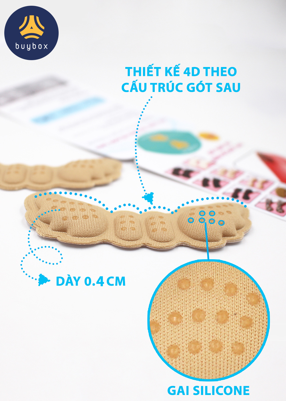 - Đặt lót 4D và dán cố định vào giày Lưu ý: Sản phẩm mang thương hiệu buybox có bao bì in logo và hướng dẫn sử dụng chi tiết đi kèm. "buybox - NGƯỜI BẠN THÂN CỦA ĐÔI CHÂN"