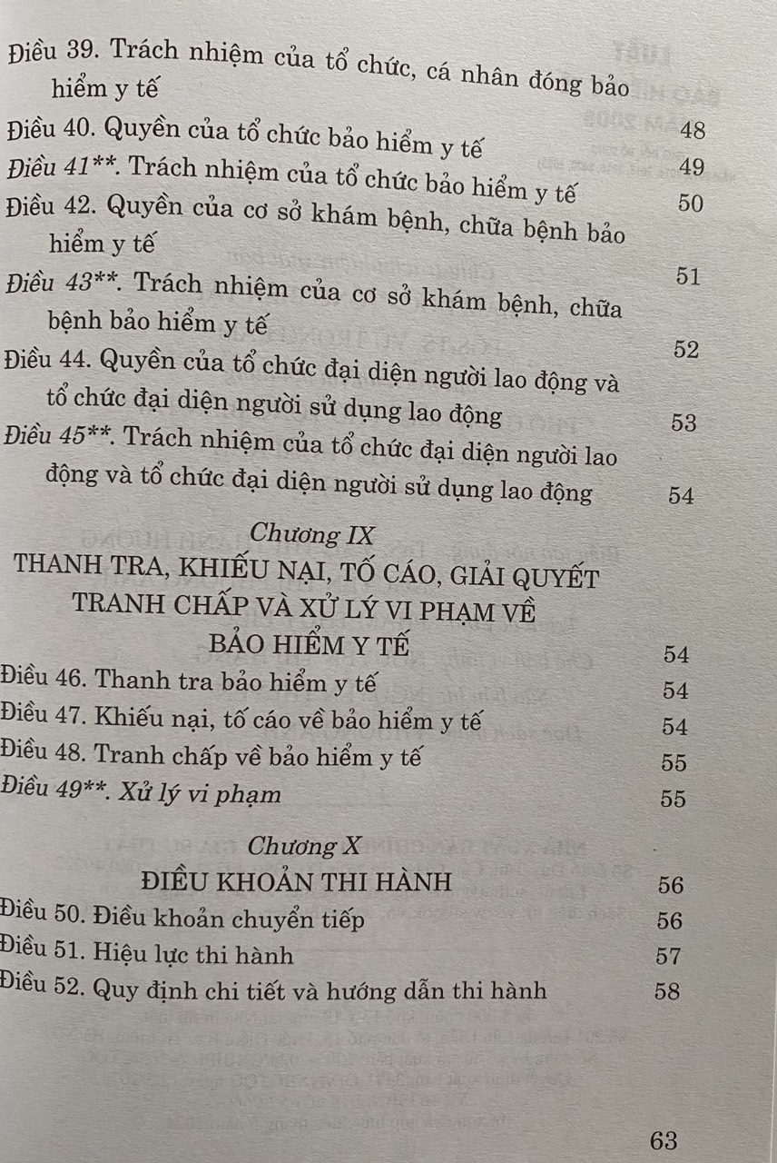 Luật Bảo hiểm y tế năm 2008 đã được Quốc hội nước Cộng hòa xã hội chủ nghĩa Việt Nam khóa XII, kỳ họp thứ 4 thông qua ngày 14/11/2008, quy định về chế độ, chính sách bảo hiểm y tế, bao gồm đối tượng, mức đóng, trách nhiệm và phương thức đóng bảo hiểm y tế; thẻ bảo hiểm y tế; phạm vi được hưởng bảo hiểm y tế; tổ chức khám bệnh, chữa bệnh cho người tham gia bảo hiểm y tế; thanh toán chi phí khám bệnh, chữa bệnh bảo hiểm y tế; quỹ bảo hiểm y tế; quyền và trách nhiệm của các bên liên quan đến bảo hiểm y tế.