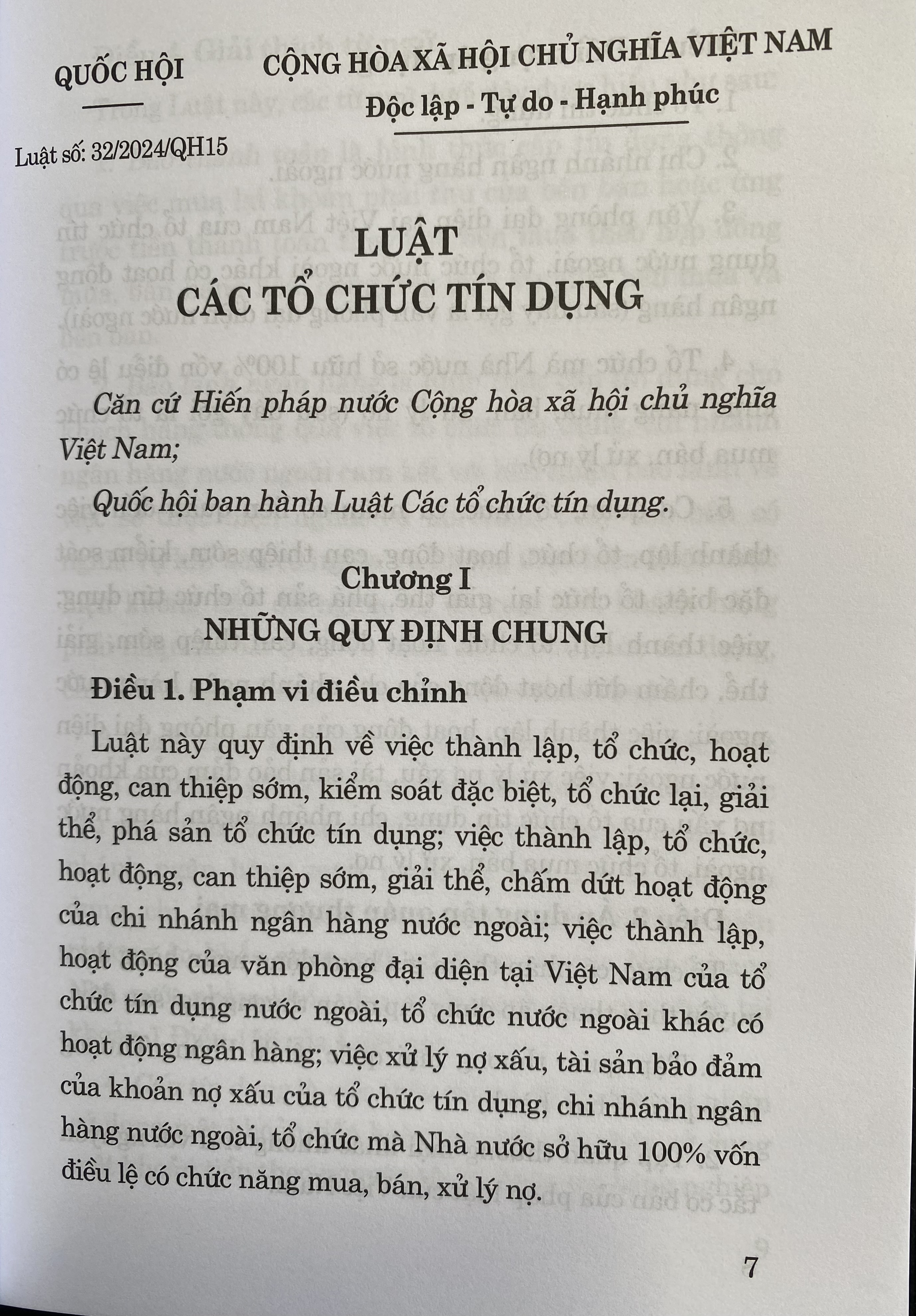 Luật Các Tổ Chức Tín Dụng 32/2024/QH15 ( Luật có hiệu lực thi hành từ ngày 01-07-2024 ) Luật này quy định về việc thành lập, tổ chức, hoạt động, can thiệp sớm,
