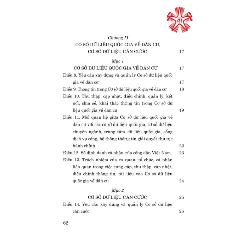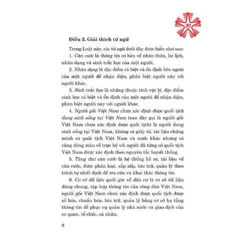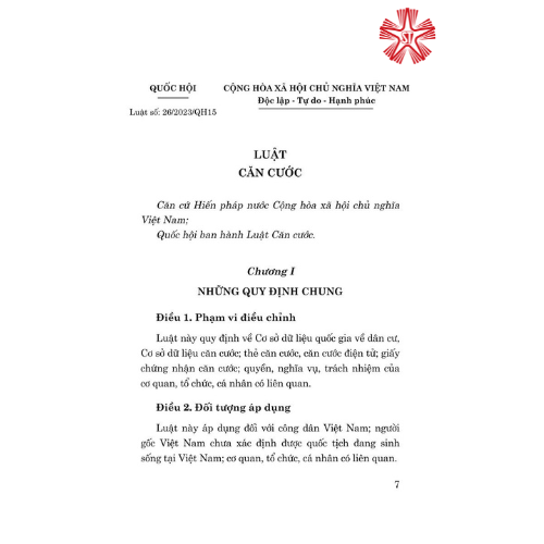 Luật Căn cước năm 2023 được Quốc hội khóa XV, kỳ họp thứ 6, thông qua ngày 27/11/2023, gồm 07 chương, 46 điều, quy định về: cơ sở dữ liệu quốc gia về dân cư, cơ sở dữ liệu căn cước; thẻ căn cước, căn cước điện tử; giấy chứng nhận căn cước; quyền, nghĩa vụ, trách nhiệm của cơ quan, tổ chức, cá nhân có liên quan. Luật có hiệu lực thi hành từ ngày 01/7/2024, trừ trường hợp quy định tại khoản 3 Điều 46.