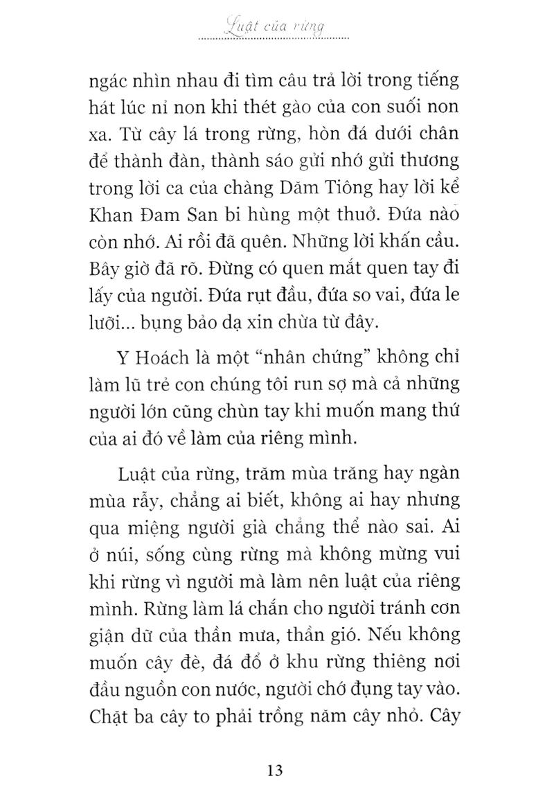 Nhiều người hỏi tôi tập tản văn Luật của rừng dành cho đối tượng nào vậy? Người lớn, con nít hay dở dở ương ương tuổi mới lớn? Một câu hỏi với tội thật khó trả lời. Tuổi nào mà không cần yêu thương, chia sẻ. Tuổi nào mà không có ước mơ và hy vọng. Tôi chỉ là người kể ra những luật lệ của rừng mà mình là chứng nhân đã từng tham dự, còn cảm nhận về Luật của rừng khắc nghiệt hay bao dung lại phụ thuộc vào cảm quan riêng của mỗi người sau khi đọc hết trang sách.