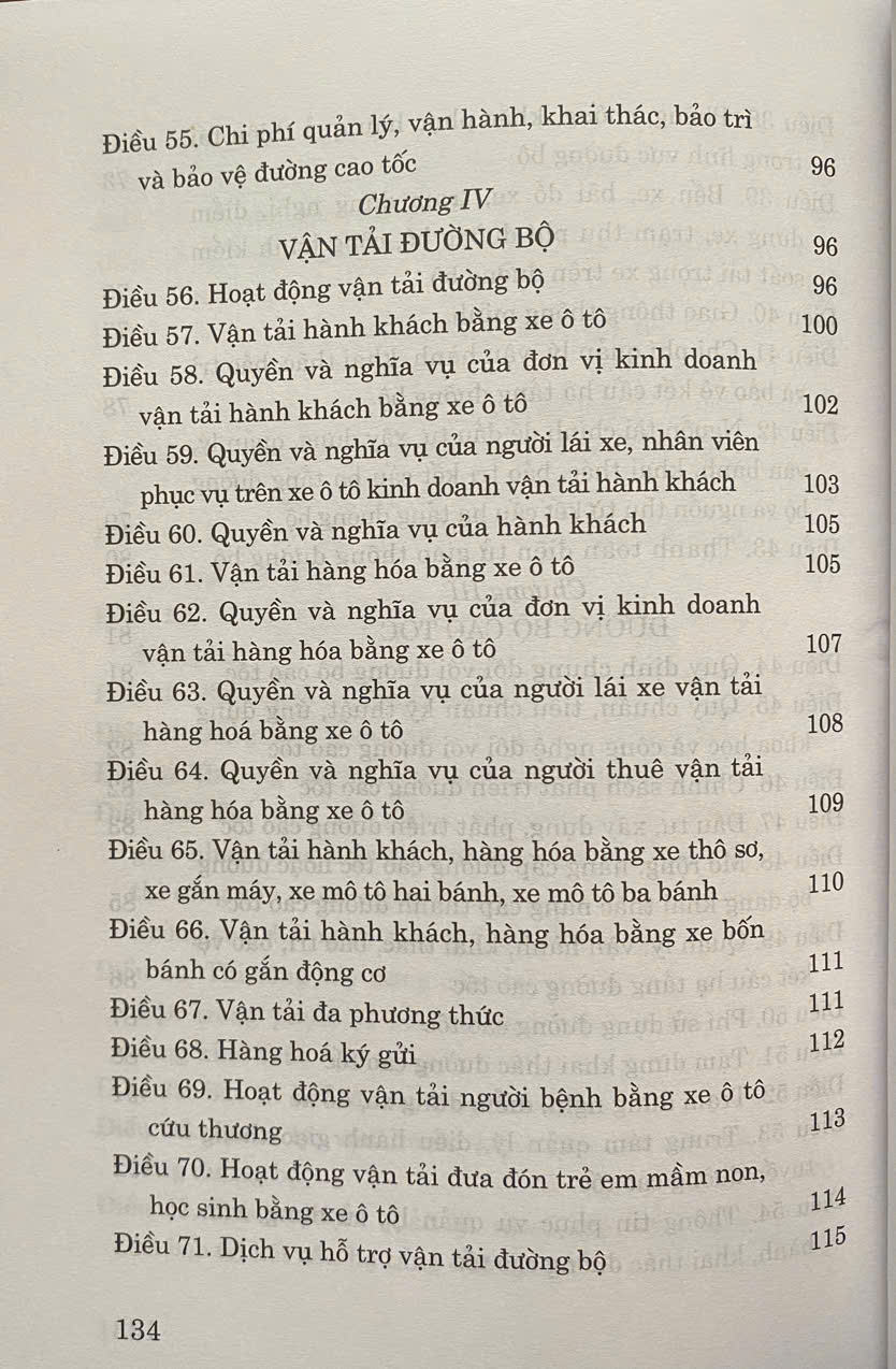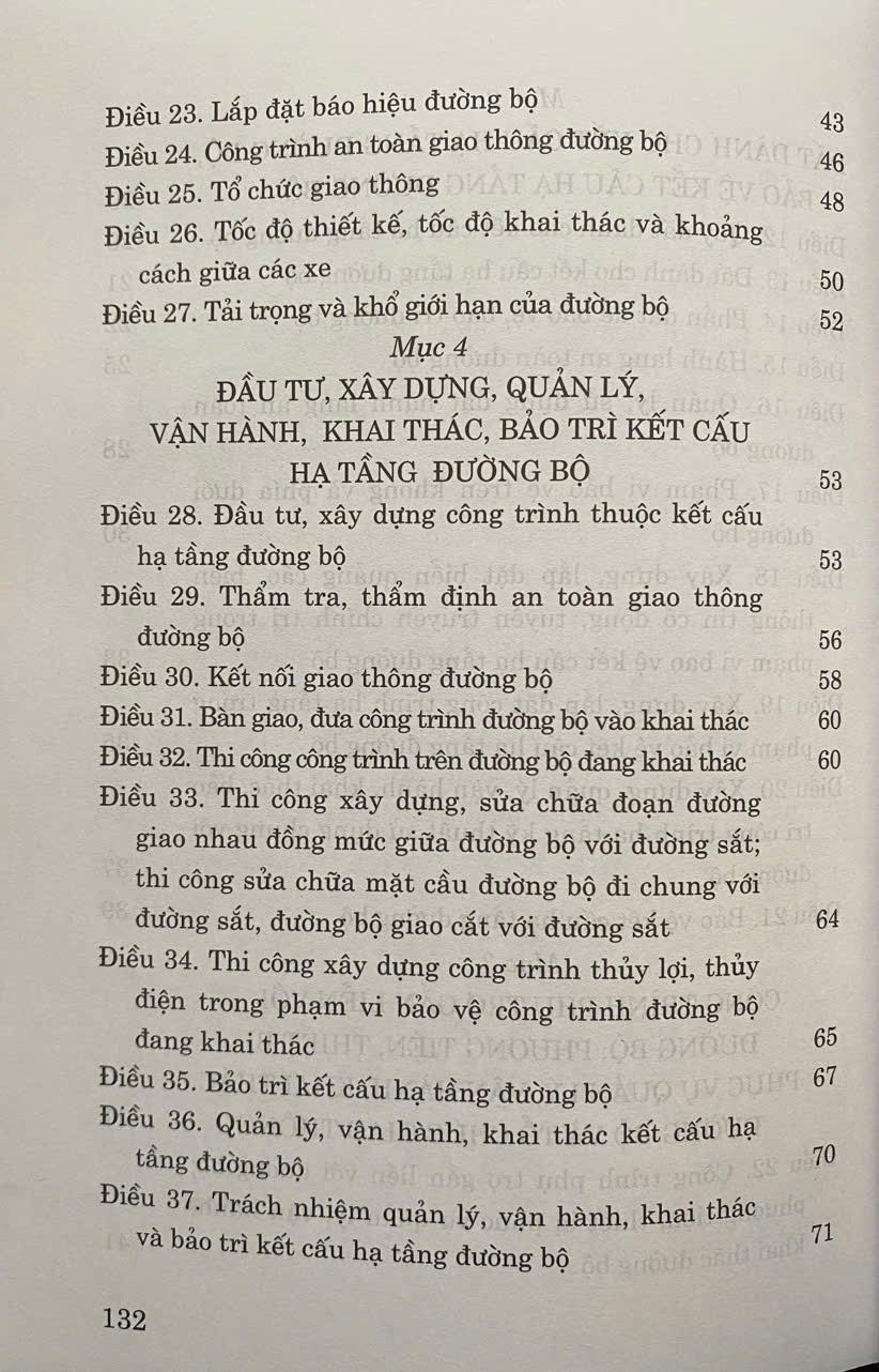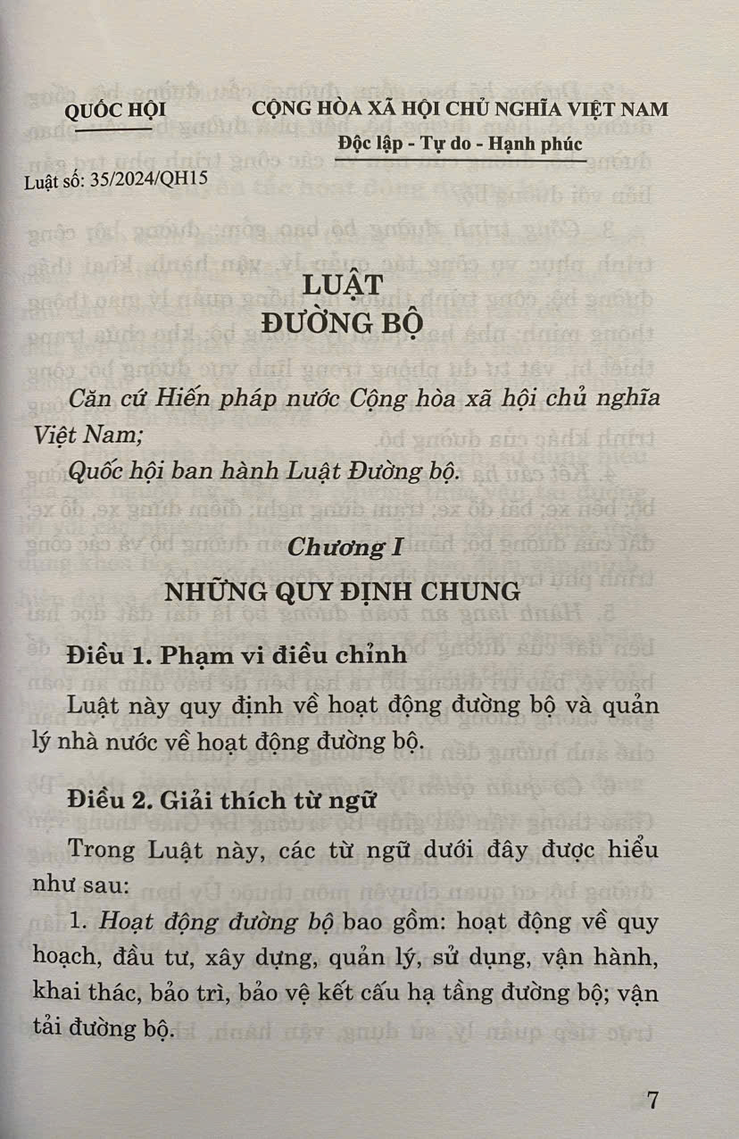 Mua tại TiktokLuật Đường Bộ số 35/2024/QH15 được Quốc hội nước Cộng hòa xã hội chủ nghĩa Việt Nam khóa XV, kỳ họp thứ 7 thông qua ngày 27 tháng 6 năm 2024 . Luật Đường bộ năm 2024 gồm 6 chương và 86 điều quy định về quy hoạch, đầu tư, xây dựng, quản lý, vận hành, khai thác, bảo trì, bảo vệ kết cấu hạ tầng đường bộ; tổ chức vận tải đường bộ và quản lý nhà nước về hoạt động đường bộ. Luật có hiệu lực áp dụng từ ngày 01 -01-2025.