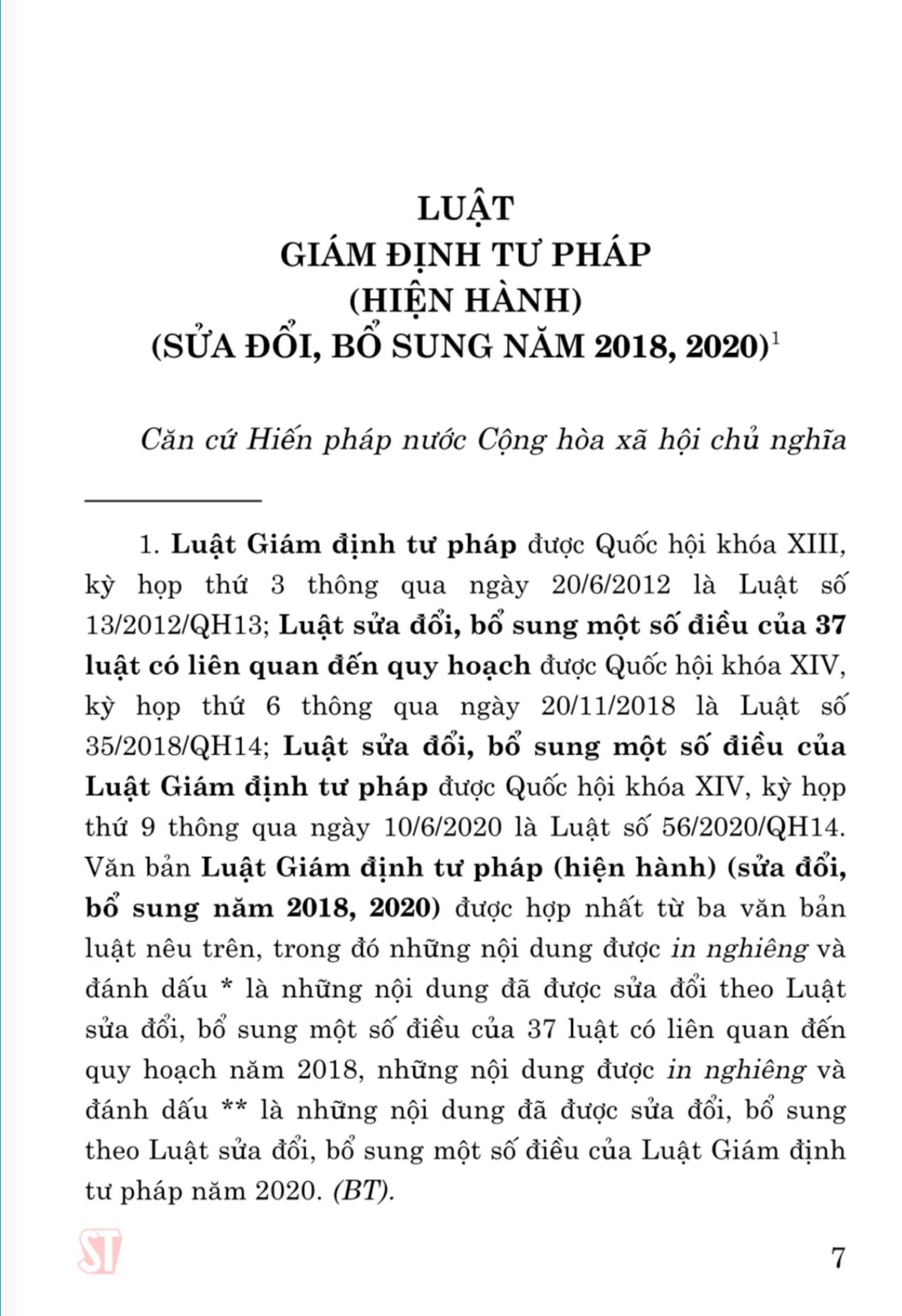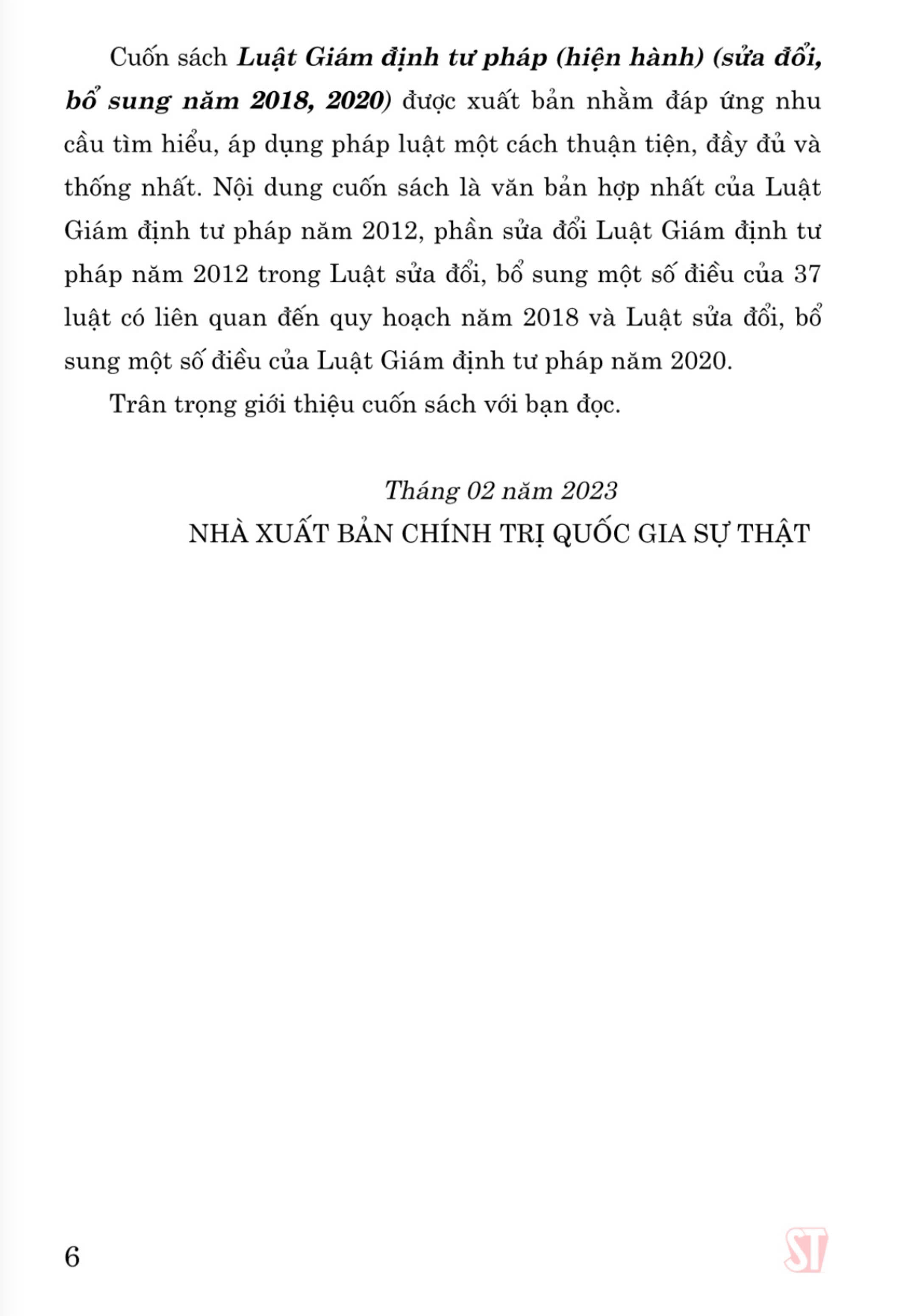 Luật Giám định tư pháp (hiện hành) (sửa đổi, bổ sung năm 2018, 2020) gồm 7 chương, 46 điều, quy định về: giám định viên tư pháp; tổ chức giám định tư pháp; người giám định tư pháp theo vụ việc, tổ chức giám định tư pháp theo vụ việc; hoạt động giám định tư pháp; chi phí giám định tư pháp, chế độ, chính sách trong hoạt động giám định tư pháp và trách nhiệm của cơ quan nhà nước đối với tổ chức, hoạt động giám định tư pháp. Luật Giám định tư pháp được Quốc hội khóa XIII, kỳ họp thứ 3 thông qua ngày 20/6/2012 và được sửa đổi, bổ sung vào các năm 2018, 2020. Cuốn sách Luật Giám định tư pháp (hiện hành) (sửa đổi, bổ sung năm 2018, 2020) là văn bản luật hợp nhất của Luật Giám định tư pháp năm 2012 và các nội dung của hai lần sửa đổi tạo thành một văn bản Luật Giám định tư pháp thống nhất hiện hành và mới nhất thuận tiện trong sử dụng tra cứu tham khảo.