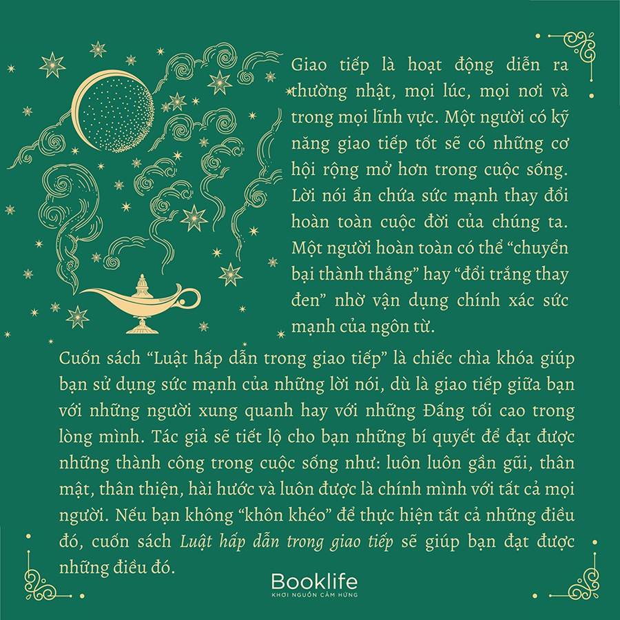 Cuốn sách “Luật hấp dẫn trong giao tiếp” là chiếc chìa khóa giúp bạn sử dụng sức mạnh của những lời nói, dù là giao tiếp giữa bạn với những người xung quanh hay với những Đấng tối cao trong lòng mình. Tác giả sẽ tiết lộ cho bạn những bí quyết để đạt được những thành công trong cuộc sống như: luôn luôn gần gũi, thân mật, thân thiện, hài hước trong mọi tình huống giao tiếp.