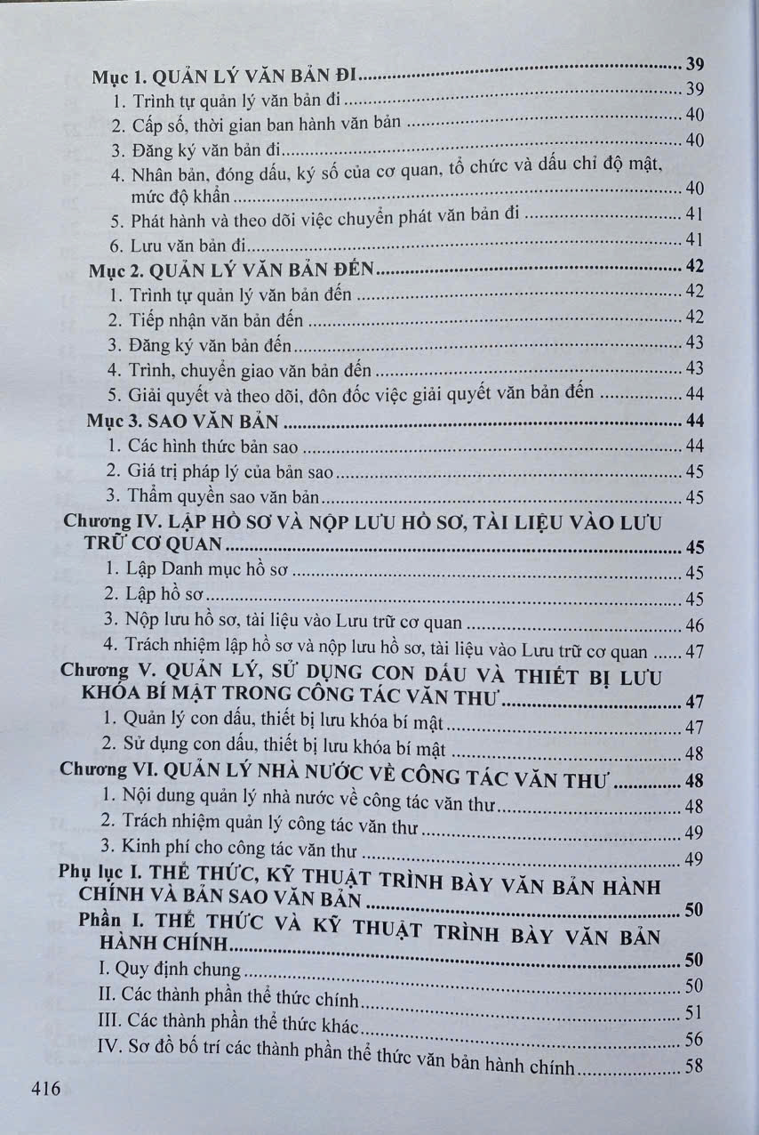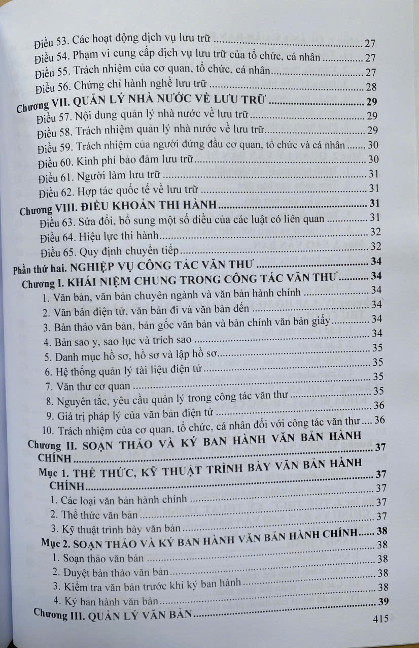 Ngày 21 tháng 6 năm 2024, tại kỳ họp thứ 7, Quốc hội khóa XV đã thông qua Luật Lưu trữ. Nhằm giúp việc quản lý và nâng cao nghiệp vụ của công tác văn thư, lưu trữ trong việc soạn thảo, ký ban hành văn bản; quản lý văn bản; lập hồ sơ và nộp lưu hồ sơ, tài liệu vào Lưu trữ cơ quan, hướng dẫn hoạt động thu thập, chỉnh lý, xác định giá trị, thời hạn bảo quản, thống kê, sử dụng tài liệu lưu trữ. Nội dung cuốn sách bao gồm những phần sau: -Phần thứ nhất. LUẬT LƯU TRỮ (được Quốc hội nước Cộng hòa xã hội chủ nghĩa Việt Nam khóa XV, kỳ họp thứ 7 thông qua ngày 21 tháng 6 năm 2024) -Phần thứ hai. NGHIỆP VỤ CÔNG TÁC VĂN THƯ -Phần thứ ba. BẢNG THỜI HẠN BẢO QUẢN HỒ SƠ, TÀI LIỆU Luatvietbook xin giới thiệu cuốn sách đến bạn đọc!