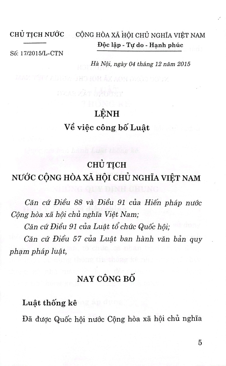 Luật thống kê năm 2015 có hiệu lực thi hành từ ngày 01-7-2016, thay thế Luật thống kê năm 2003 đã tạo cơ sở pháp lý vững chắc cho hoạt động thống kê, sử dụng thông tin thống kê, khắc phục bất cập của Luật thống kê năm 2003 và tiếp thu các nguyên tắc mới của thống kê Liên hợp quốc trong tiến trình hội nhập.