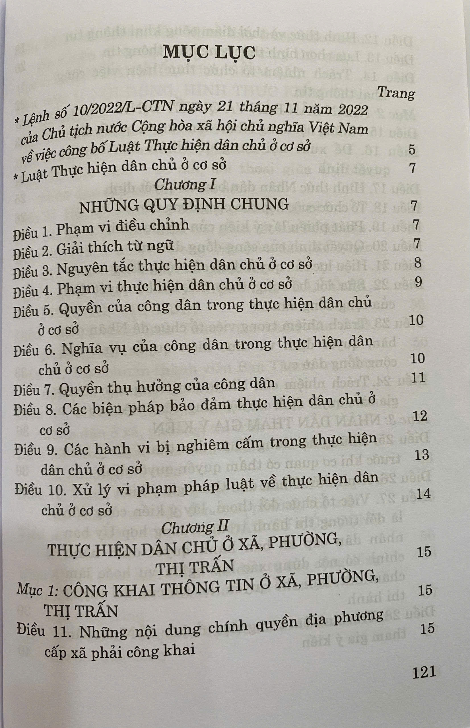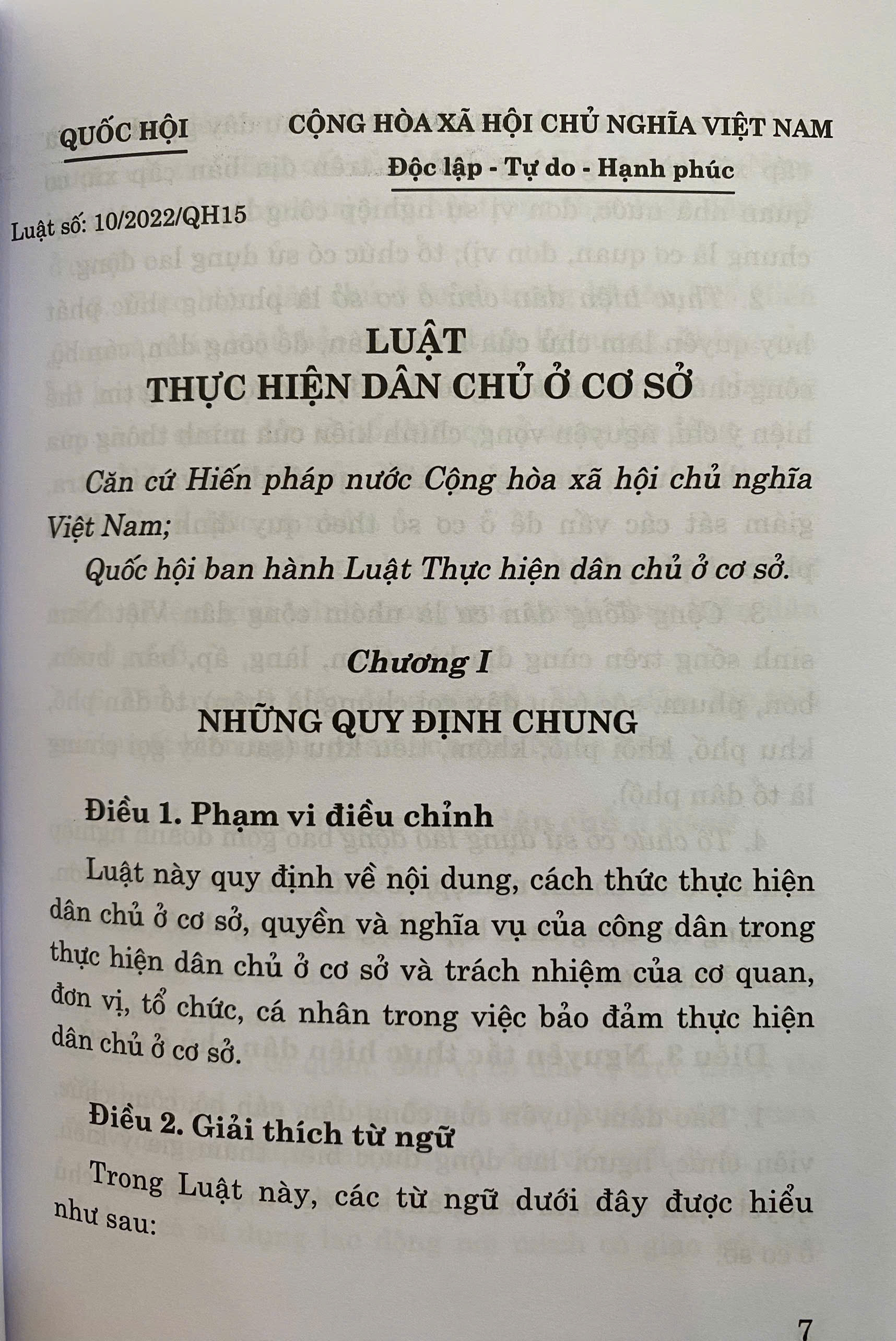 Luật Thực Hiện Dân Chủ Ở Cơ Sở số 10/2022/QH15 đã được Quốc hội nước Cộng hòa xã hội chủ nghĩa Việt Nam khóa XV, kỳ họp thứ 4 thông qua ngày 10 tháng 11 năm 2022. Luật gồm có 6 chương, 91 điều. Luật này có hiệu lực áp dụng kể từ ngày 01 tháng 07 năm 2023.