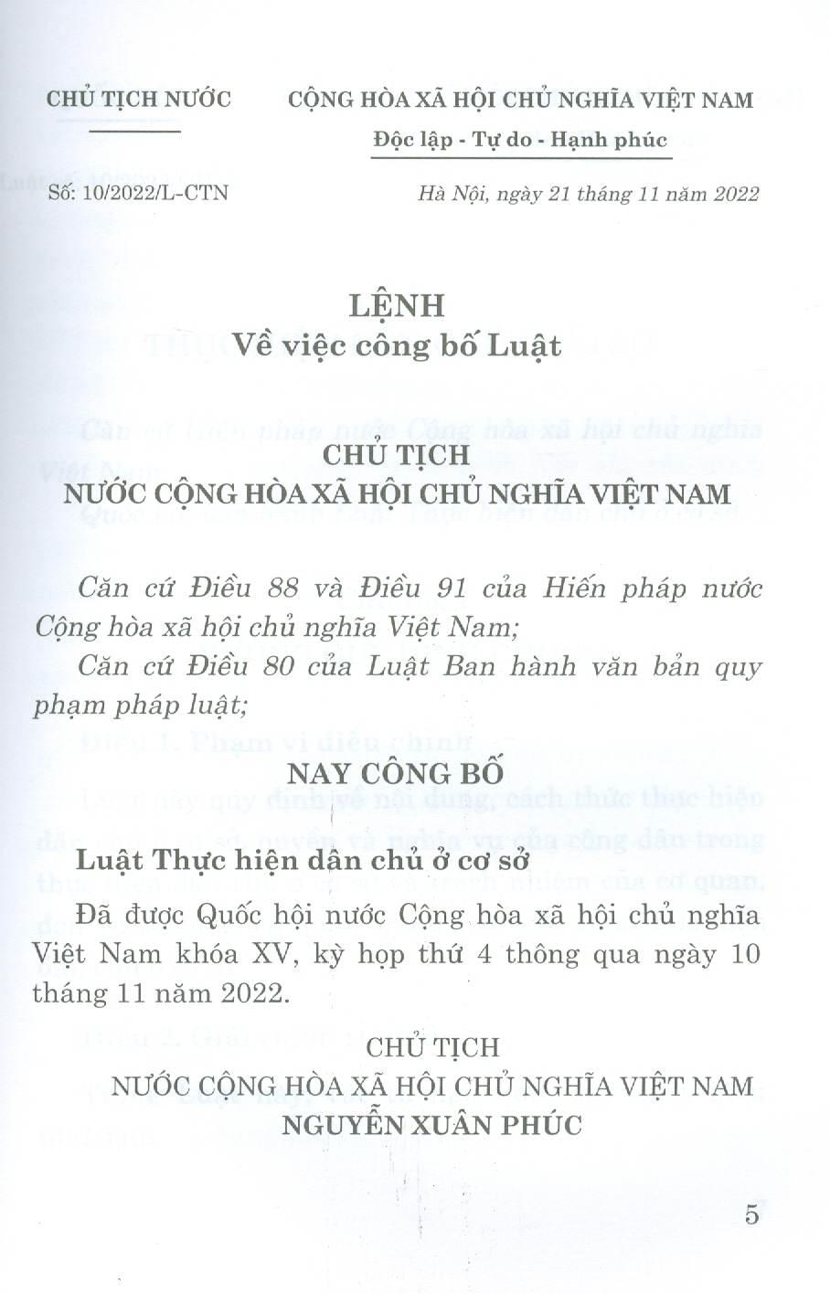 Mua tại TiktokNgày 10/11/2022 tại Kỳ họp thứ 4, Quốc hội khoá XV, Quốc hội tiến hành biểu quyết thông qua Luật Thực hiện dân chủ ở cơ sở. Theo đó, Quốc hội đã ban hành toàn văn Luật Thực hiện dân chủ ở cơ sở 2022 gồm có 6 Chương và 91 Điều. Về hiệu lực thi hành, căn cứ khoản 1 Điều 90 Luật Thực hiện dân chủ ở cơ sở 2022 thì Luật này có hiệu lực thi hành từ 01/07/2023.