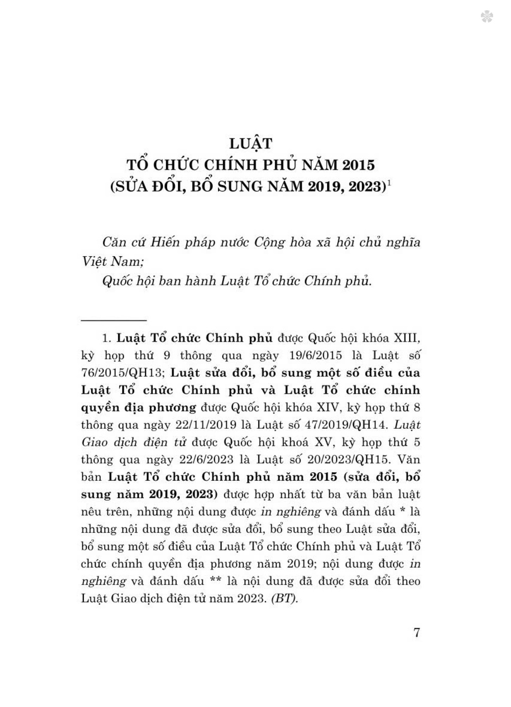 Cuốn sách Luật Tổ chức Chính phủ năm 2015 (sửa đổi, bổ sung năm 2019, 2023) là văn bản được hợp nhất từ Luật Tổ chức Chính phủ năm 2015; Luật sửa đổi, bổ sung một số điều của Luật Tổ chức Chính phủ và Luật Tổ chức chính quyền địa phương năm 2019; Luật Giao dịch điện tử năm 2023 (nội dung sửa đổi luật Tổ chức Chính phủ năm 2015), giúp bạn đọc thuận tiện trong việc tìm hiểu và áp dụng pháp luật về tổ chức Chính phủ.