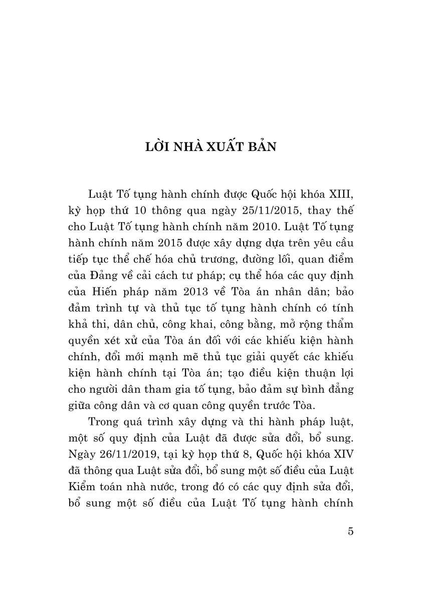 Nhằm đáp ứng nhu cầu của bạn đọc trong việc nghiên cứu, tìm hiểu, áp dụng pháp luật một cách thuận tiện, đầy đủ và thống nhất, Nhà xuất bản Chính trị quốc gia Sự thật xuất bản cuốn sách Luật Tố tụng hành chính năm 2015 (sửa đổi, bổ sung năm 2019, 2024, 2025). Nội dung cuốn sách là văn bản hợp nhất của Luật Tố tụng hành chính năm 2015 và các nội dung sửa đổi, bổ sung từ ba văn bản luật nêu trên.