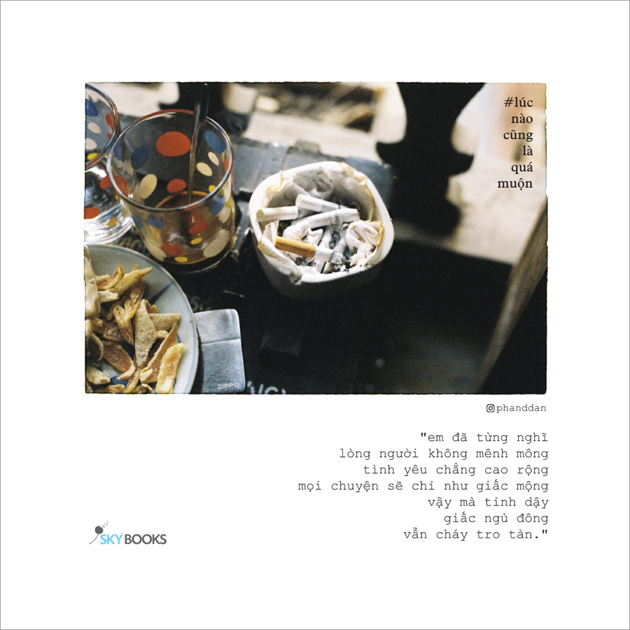 Và hơn thế, người đọc còn dễ dàng bắt gặp thế giới nội tâm của chính mình trong từng câu chữ, khi đó "Lúc nào cũng là quá muộn”, giống như lời hỏi thăm, tâm sự với những ai đang loay hoay, chơi vơi giữa cuộc đời. Mong rằng bạn có thể đọc từng trang sách và cảm thấy được an ủi, xoa dịu đi một phần nào đó nỗi buồn, cũng có thêm phần nào đó dũng khí để bước qua những câu chuyện đã cũ và thấy lòng mình yên ả, nhẹ bẫng hơn.