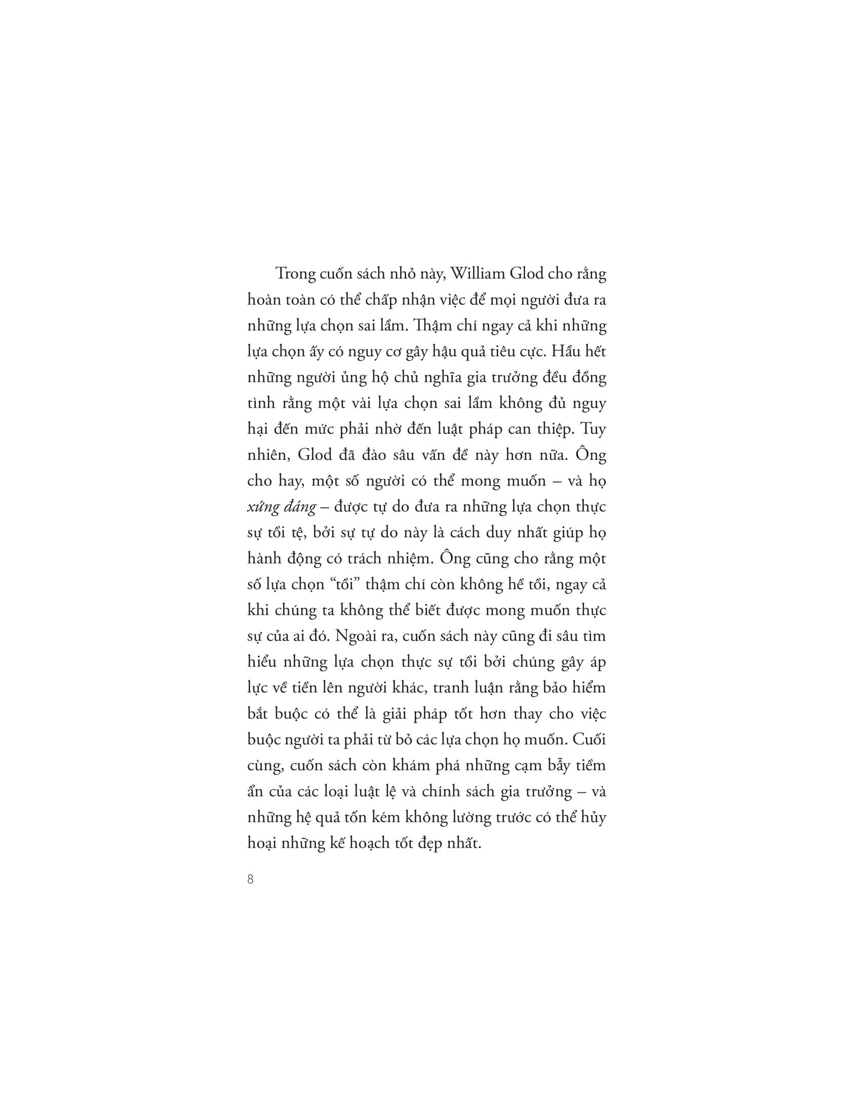 Hầu hết những người bảo vệ chủ nghĩa gia trưởng cũng đều đồng tình rằng một số lựa chọn tồi không nguy hại đến mức phải nhờ đến luật pháp ngăn chặn chúng. Tuy nhiên, Glod còn đi xa hơn khi lập luận rằng một số người có thể muốn - và xứng đáng - được tự do đưa ra những lựa chọn thực sự tồi tệ bởi vì sự tự do đó là cách duy nhất để họ có thể hành động có trách nhiệm. Ông cũng lập luận rằng một số lựa chọn “tồi tệ” thậm chí không tệ như chúng ta nghĩ, ngay cả khi chúng ta không thể biết được mong muốn thực sự của một người.