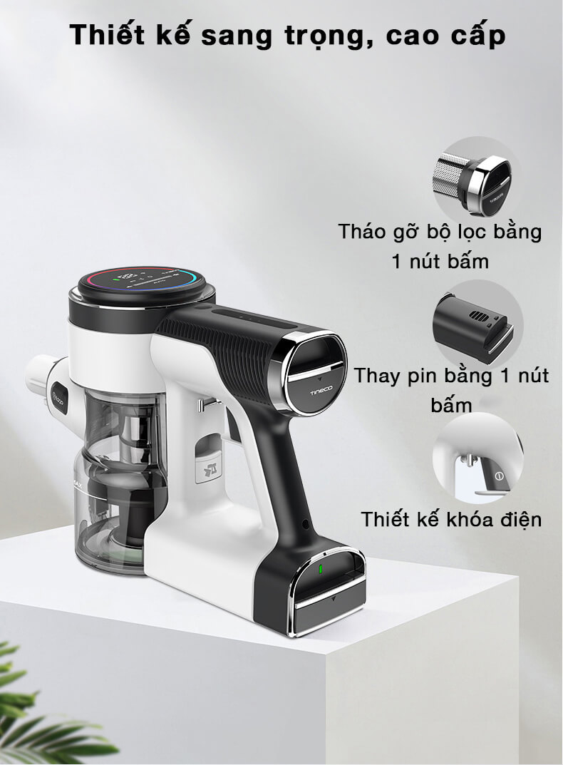 - Công nghệ loại bỏ bụi thông minh được cấp bằng sáng chế. Cảm biến bụi bẩn thông minh, tự động điều chỉnh lực hút và hiển thị độ sạch trên màn hình. Máy hút bụi Tineco thay thế các chức năng truyền thống và mở ra một kỷ nguyên mới vè làm sạch bằng trí thông minh