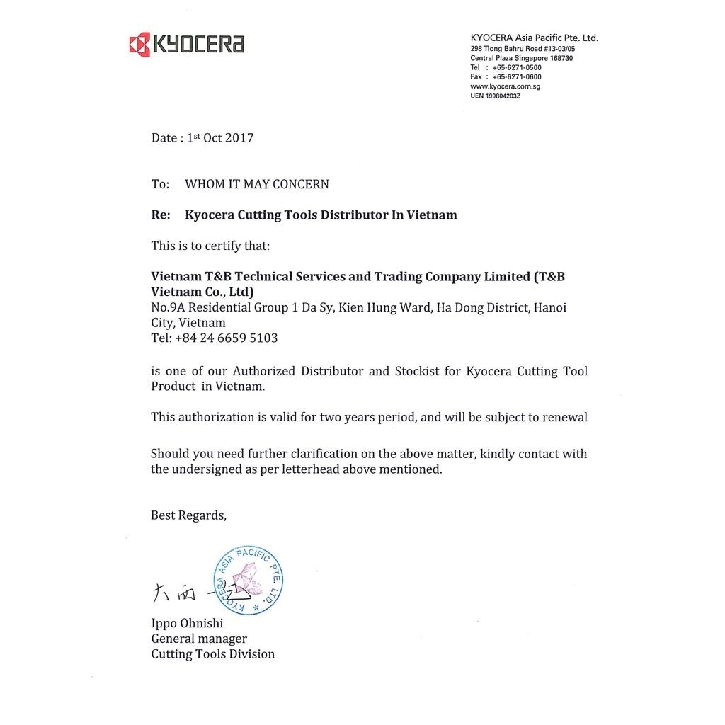 CÔNG TY TNHH THƯƠNG MẠI VÀ DỊCH VỤ KỸ THUẬT T&B VIỆT NAM là nhà phân phối chính thức của Dụng cụ cắt KYOCERA tại Việt Nam , chúng tôi cam kết mang đến cho khách hàng những giải pháp tối ưu, sản phẩm chất lượng, giá cả cạnh tranh và thời gian giao hàng nhanh nhất.