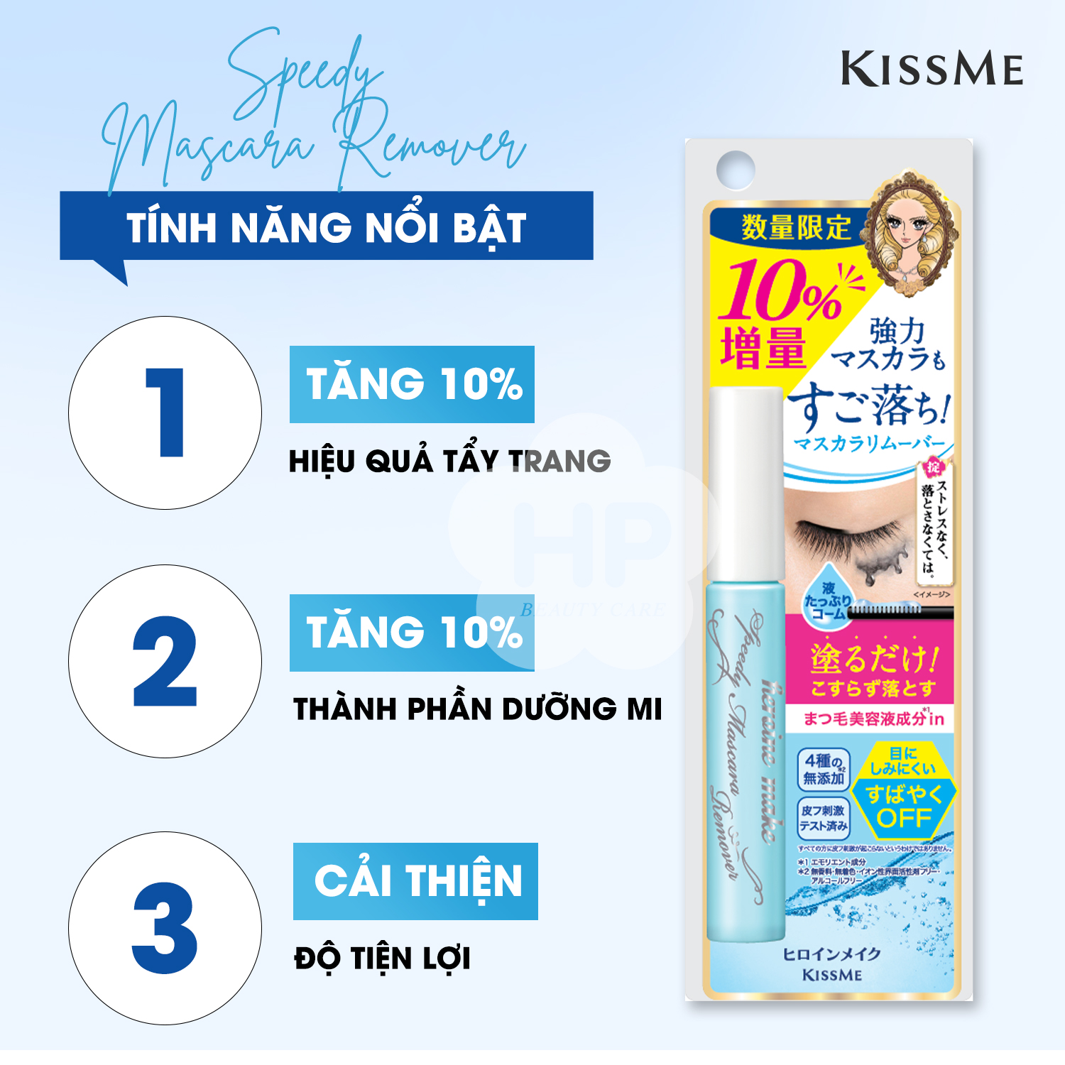 Mascara Tẩy Trang Mắt Kissme Heroine Make (7.3mL) Xuất xứ: Nhật Bản Thương hiệu: Kissme Mã vạch: 4901433040082 HSD: 5 năm kể từ NSX Dung dịch tẩy trang mi sẽ hòa tan ngay lập bởi công thự cải tiến giúp loại bỏ nhẹ nhàng lớp mascara không thấm nước, ngoài ra thành phần tinh dầu hoa trà, sữa ong chúa nụ tầm xuân..có lượng ẩm cao giúp nuôi dưỡng làn mi chắc khoẻ và giảm gãy rụng khi sử dụng . 1/ Công dụng :