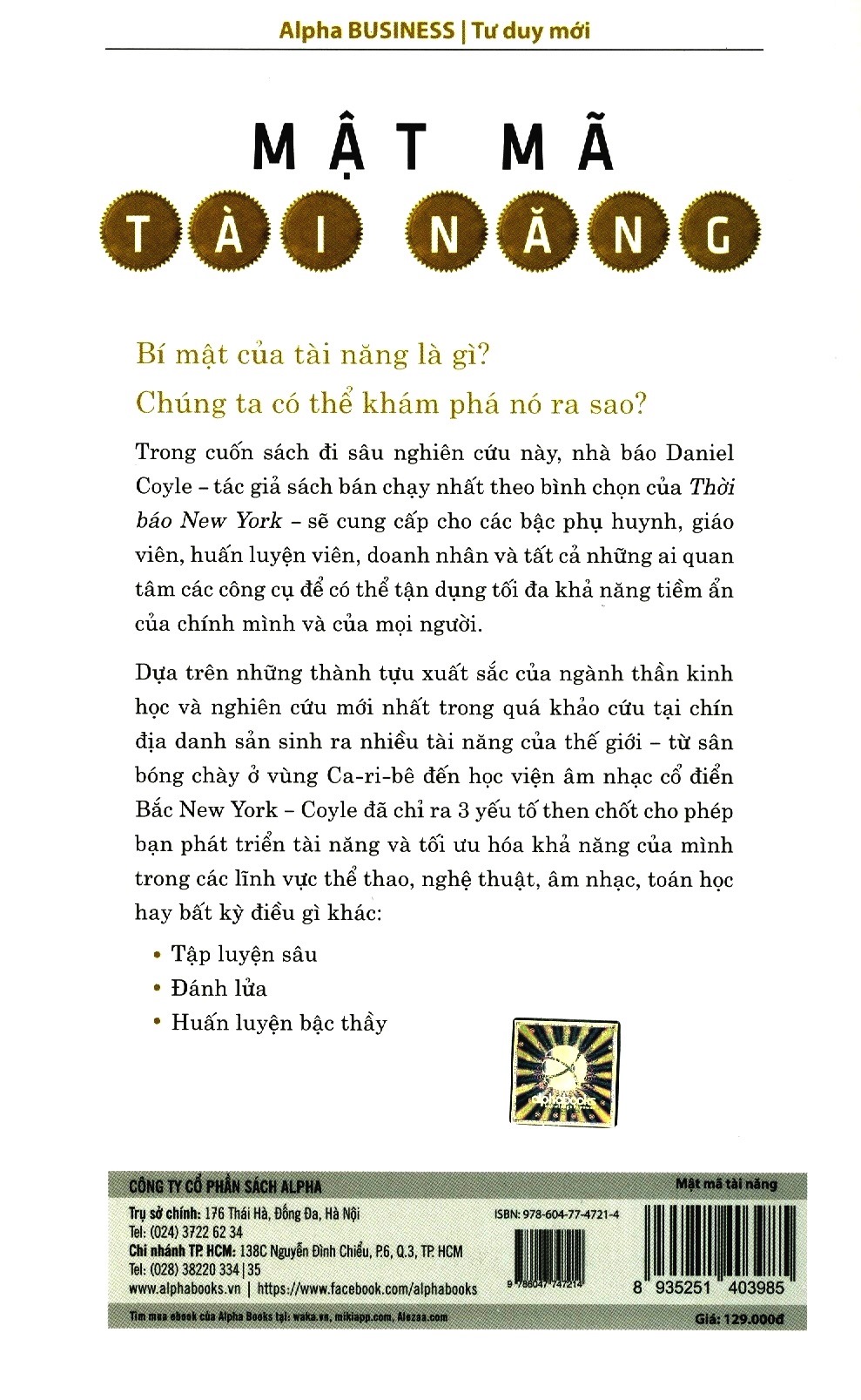 Dù bạn đang huấn luyện cho một đội bóng bầu dục hay dạy một đứa trẻ chơi đàn piano, viết tiểu thuyết hay cố gắng cải thiện cú vung gậy trong môn bóng chày thì cuốn sách mang tính cách mạng này sẽ chỉ cho bạn biết cách nuôi dưỡng và phát triển tài năng thông qua việc khai thác và sử dụng một cơ chế mới được khám phá của não bộ.