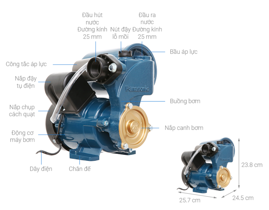 Loại máy: Tăng áp (dùng cho khu vực áp lực nước yếu) Chức năng: Tăng áp lực nước cho máy giặt, máy nước nóng, máy lọc nước hoặc các sản phẩm cần áp lực nước đủ mạnh để hoạt động tốt Công suất: 200W Lưu lượng tối đa: 45 lít/phút Đẩy/hút tối đa: Đẩy cao 9m - Hút sâu 9m Đường kính ống hút/thoát: 25mm/25mm Chuẩn chống nước: IPX4 - Chống nước bắn vào thiết bị ở mọi vị trí Kích thước - Trọng lượng: Dài 25.7 cm - Rộng 24.5 cm - Cao 23.8 cm - Nặng 8.3 kg Thương hiệu của: Nhật Bản Được thiết kế với kiểu dáng nhỏ gọn, hiện đại với buồng bơm làm bằng gang, nắp buồng bơm và cánh bơm bằng đồng cho khả năng chịu ma sát và nhiệt độ cao, đảm bảo lưu thông nước ổn định, giúp máy bền bỉ và tiết kiệm điện tối ưu với hiệu suất cao. Máy bơm tăng áp (máy bơm áp lực) này có công suất 200W thích hợp cho các hộ gia đình đang sử dụng nguồn nước yếu, áp lực thấp, gây khó khăn cho sinh hoạt, máy sẽ giúp tăng áp lực nước khi bơm ra để sử dụng phục vụ cho gia đình tốt hơn trong việc sử dụng các thiết bị như vòi sen, máy giặt, bình nóng lạ hỗ trợ tối đa trong sinh hoạt hằng ngày.   Lưu ý: Máy bơm Panasonic 200W này chỉ dùng hiệu quả cho cả gia đình (dùng một lúc: máy giặt, bồn rửa chén, vòi ). Nếu chỉ dùng cho 1 thiết bị riêng biệt thì sẽ gây ra lãng phí vì công suất lớn. Với trường hợp này, bạn có thể tìm mua các loại máy bơm mini với công suất nhỏ hơn để tiện sử dụng (dưới 100W). Máy bơm nước này sẽ có thể hoạt động để đáp ứng tốt nhu cầu tăng áp lực nước cho gia đình trong quá trình sinh hoạt với công suất 200W, cho lưu lượng nước tối đa bơm được đạt đến 45 lít/ phút, tuy nhiên lưu lượng nước bơm được sẽ giảm nếu vị trí lắp có địa thế phức tạp. Với hệ thống tự động đóng/ ngắt, máy sẽ tự bật/ tắt khi mở hay khóa nước rất tiện lợi, hệ thống tự động đóng/ ngắt có mối nối làm bằng bạch kim có thể thực hiện đóng/ ngắt một triệu lần mà không làm giảm hiệu suất của máy. Bên cạnh đó, khí Ni-tơ được sử dụng trong bình tích trữ giúp máy hoạt động ổn định với hiệu suất tối ưu. Được hãng trang bị chuẩn chống nước IPX4, đồng nghĩa máy bơm nước tăng áp Panasonic A-200JAK 200W có thể kháng nước bảo vệ động cơ bên trong dù có bị nước bắn vào bất kì vị trí nào trên máy. Ngoài ra máy còn được trang bị thêm 2 lớp cách nhiệt đến 130⁰C đảm bảo an toàn, chống chập điện, chống ăn mòn và ngắn mạch, sản phẩm được bảo vệ tối ưu. Khi nhận thấy nhiệt độ bơm quá cao (trên 130⁰C ) máy bơm nước Panasonic sẽ tự ngắt điện. Hơn nữa, lõi quay motor quấn dây đồng chống rỉ sét đảm bảo máy hoạt động liên tục 8000 giờ không ngừng nghỉ nên khá an toàn.   Bên cạnh đó, với bầu tăng áp làm bằng cao su Butyl xếp theo nếp chắc chắn hơn giúp máy hoạt động bền bỉ và ổn định. Ngoài ra với cánh bơm được thiết kế di động có khả năng tự do dịch chuyển dọc theo trục bơm, giúp ngăn ngừa khả năng cánh bơm bị kẹt vào buồng bơm do sỏi, cát lọt vào, giúp bảo vệ máy tránh hư hại tối đa.  Nhìn chung, máy bơm tăng áp Panasonic này phù hợp sử dụng cho gia đình có địa thế lắp đặt phức tạp, đang sử dụng nguồn nước yếu, gây khó khăn khi sử dụng các thiết bị trong nhà như vòi, sen, máy giặt, bình nóng lạ với việc trang bị nhiều tính năng an toàn, bảo vệ sản phẩm như chống nước, cách nhiệt, tự ngắt điệ chắc chắc sản phẩm sẽ là thiết bị có khả năng sử dụng ổn định, bền bỉ cùng nâng cao chất lượng cuộc sống cho gia đình.   Lưu ý khi sử dụng máy bơm nước Panasonic - Không sử dụng máy bơm nước này với nguồn nước không ổn định, lúc có lúc không. Vì khi mất nước, máy sẽ hoạt động khi không có nước, dẫn đến nhanh mòn phớt, trục bơm gây rỉ nước buồng bơm.   - Không sử dụng máy với nguồn nước nóng trên 45⁰C, nguồn nước bẩn có nhiều cặn, sỏi, sẽ làm kẹt cánh bơm, giảm tuổi thọ của máy bơm. Trường hợp nguồn nước có nhiều cặn, sỏi thì bạn nên mua bộ lọc để lọc nguồn nước trước khi bơm.   - Khi lắp máy bơm, để đạt được hiệu quả đẩy nước tốt nhất nên lắp càng gần nguồn nước đầu vào