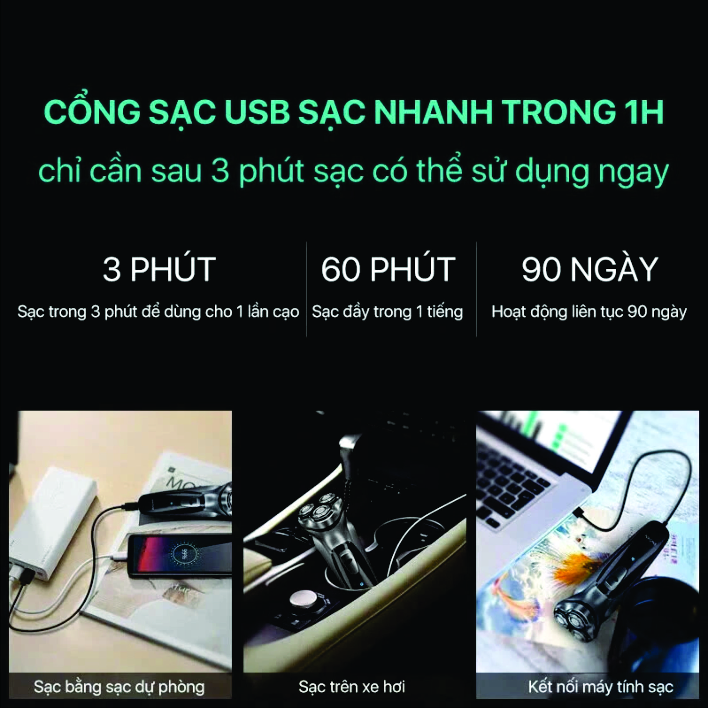 Với chiếc máy cạo râu này thì chỉ cần 1 giờ sạc đầy qua giao diện USB Type-C người dùng đã có thể sử dụng liên tục trong 90 phút. Cụ thể trung bình thời gian sử dụng khoảng 1.5 phút thì bạn đã có thể dùng liên tục trong vòng 2 tháng. Máy cũng được tích hợp hệ thống sạc thông minh, chống quá tải và bảo vệ mạch.