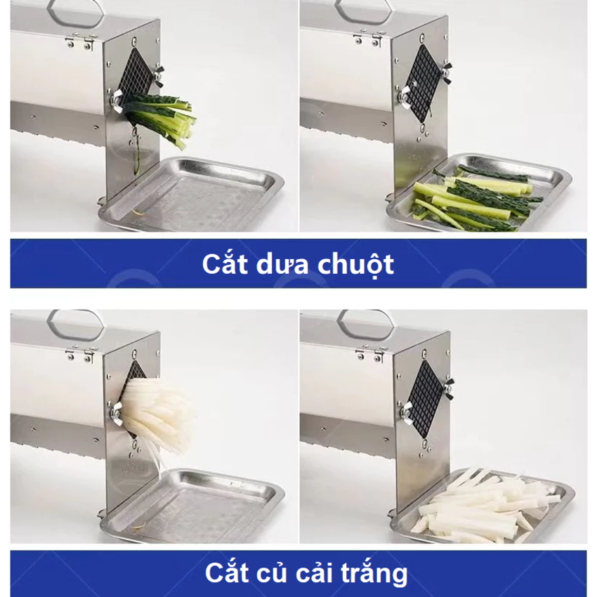 - Để có cách làm khoai chiên giòn đều chuẩn vị thì khâu chế biến cắt sợi chiếm vai trò khá quan trọng, vì phải cắt có độ dày, mỏng đồng đều nhau thì khi chiên, xào, lắc các món ăn từ khoai tây, khoai lang, hay mứt ô, mai của cà rốt, củ cải, mới đạt độ chuẩn vị, ngon giòn nhất. Vì vậy một chiếc máy cắt sợi rau củ là thiết bị công nghệ, giải pháp hoàn hảo cho các quán ăn vặt, quán ăn vỉa hè, KFC, quán cafe, nhà hàng, khách sạn hay các hộ kinh doanh nhỏ lẻ. - Máy cắt khoai lang chiên sử dụng động cơ có công suất 550W, nguồn điện 24V vận hành ổn định, với 2 công tắc điều khiến tiến và lùi. Nút điều khiển được bổ trí ngay trên thân máy giúp người dùng linh hoạt Thiết kế nhỏ gọn, chất liệu inox cao cấp an toàn, sạch sẽ