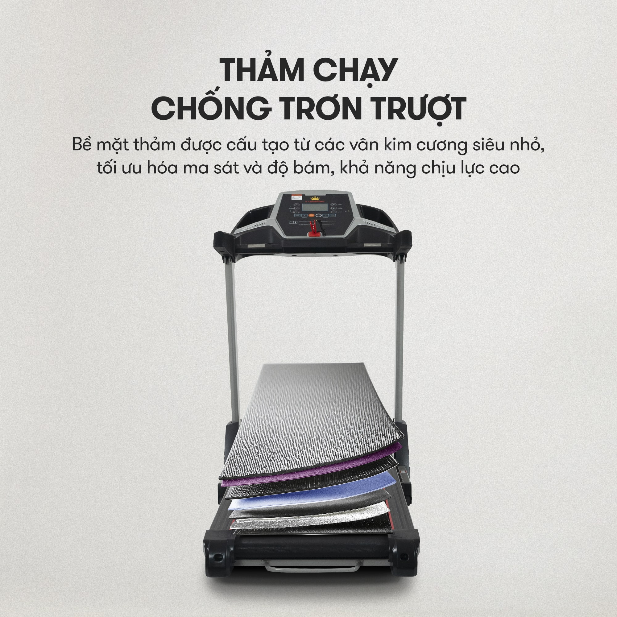 Thảm chạy rộng rãi 120x42cm thiết kế từ nhiều lớp khác nhau, đảm bảo chống trơn trượt và độ bền cao theo thời gian.