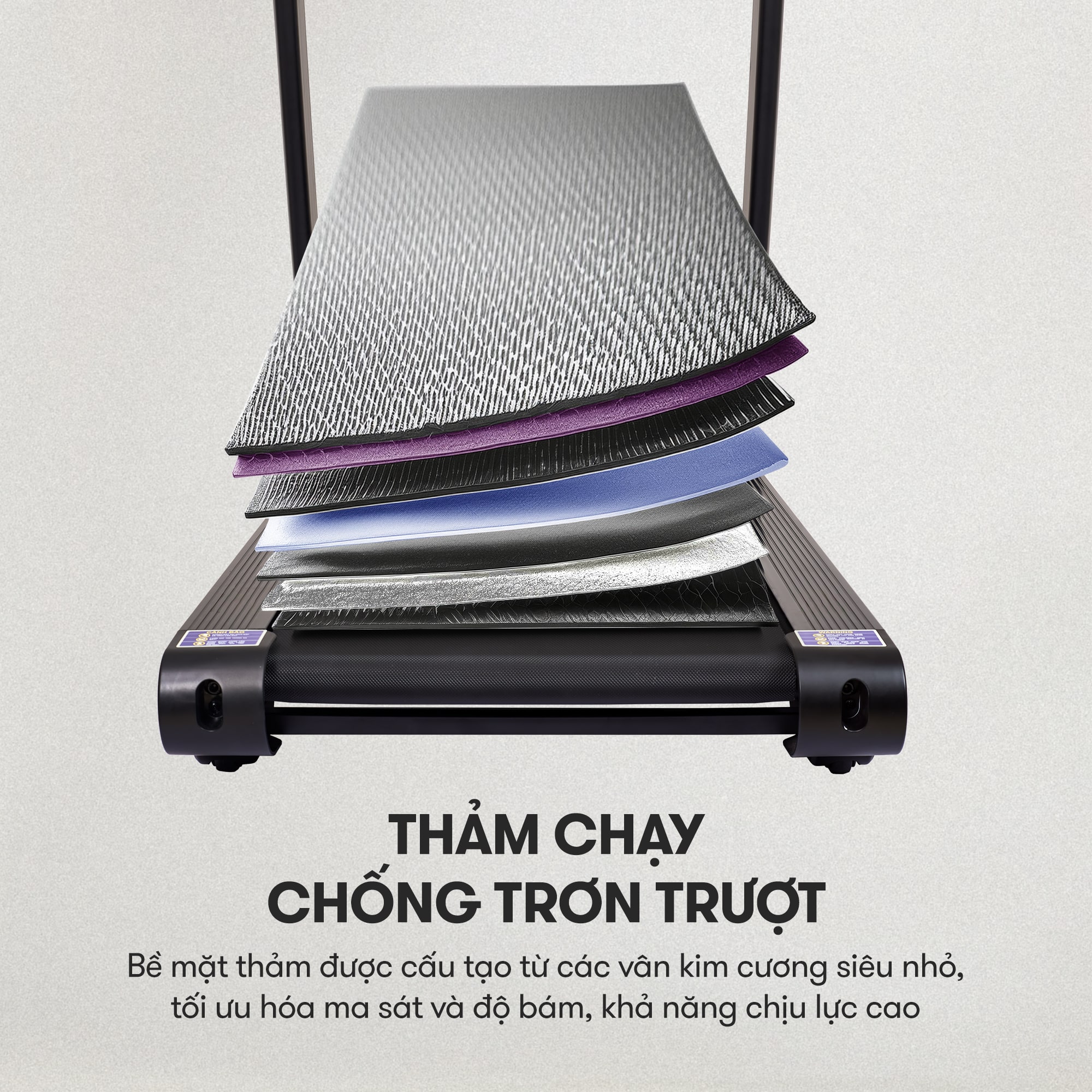 Hiểu được điều đó, mẫu máy chạy bộ KingSport Legend K-06 được trang bị thảm chạy vân kim cương. Giúp các bước chạy của bạn được bán chắc xuống sàn mà không xảy ra tình trạng chấn thương. Bên cạnh đó, thảm chạy này có khả năng chống mài mòn hiệu quả nên tuổi thọ của thảm lâu hơn những loại thảm thông thường trên thị trường. Chất liệu tạo nên thảm chạy vân kim cương có khả năng chống nước và chống ẩm mốc tốt nên bền mặt thảm luôn bền đẹp ngay cả khi đã qua một thời gian dài sử dụng.