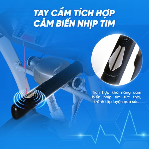 Tay cầm được thiết kế với chất liệu bám chắc tuyệt đối, bảo vệ người dùng chống trơn trượt. Đặc biệt chúng còn được tích hợp cảm biến nhịp tim, tránh tập luyện quá sức.