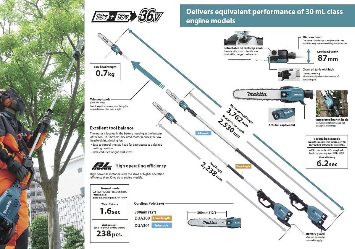 Trong hộp có: Máy Makita DUA300ZB, Lam 12, vỏ xích, bộ xích, cờ lê 13-16, dầu, dây đeo vai, kính bảo hộ. Máy chưa bao gồm pin và sạc.