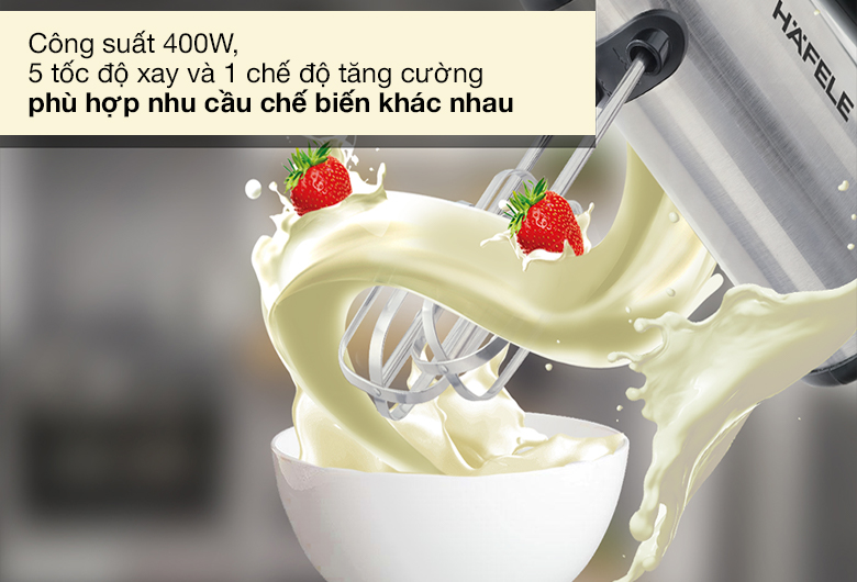 Máy đánh trứng Hafele hỗ trợ hiệu quả nhu cầu làm bếp với với đa chức năng: đánh trứng, trộn bột, trộn kem Nhào trộn nhanh, hiệu quả và bền bỉ nhờ công suất hoạt động