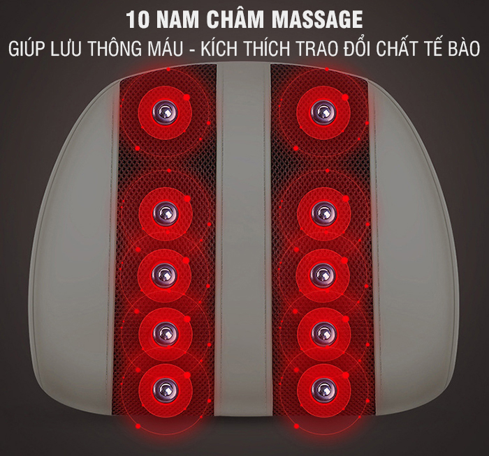Với 10 nam châm massage được bố trí đều trên đệm, khi đệm hoạt động thì các nam châm sẽ kích hoạt từ tính của cơ thể và giúp tăng lưu lượng máu, cung cấp nhiều oxi và chất dinh dưỡng cho các tế bào tổn thương, ngăn chặn chứng viêm hỗ trợ điều trị đau mỏi hiệu quả.