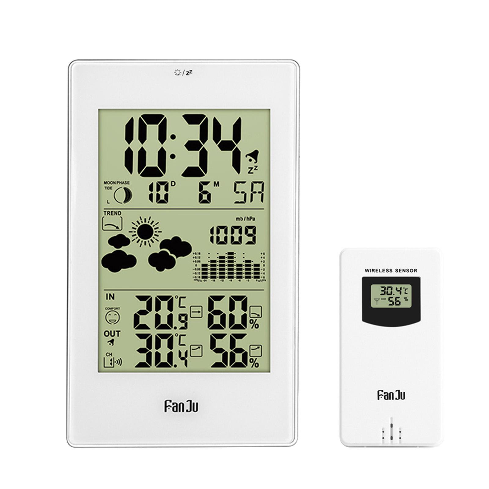 Specifications: Brand: FanJu Color: White Material: Plastic Application: for Indoor and Outdoor Use Indoor Temperature Range: -9.9℃~50℃ (14.2℉~122℉) Outdoor Temperature Range: -20℃~60℃ (-4℉~140℉) Humidity Range: 20%-95%RH Barometric Pressure Range: 600 hPa/mb~1100 hPa/mb (17.72 inHg~32.48 inHg) Temperature Display Unit: ℃/ ℉ Selectable Temperature Resolution: 0.1℃/ 0.1℉ Humidity Resolution: 1% Comfort Level: 5 Kinds Weather Forcast: 6 Kinds (Sunny, Slightly Cloudy, Cloudy, Rainy, Heavy Rainy, Snowy) Time Format: 12/ 24H Calendar: 2001~2099 year Wireless Range: about 60m/ 196ft (If there is an obstacle, the transmission distance will be reduced accordingly) Power Supply: Main Unit: 2 1.5V AA/ LR6 Battery (Not included); Sensor: 2 1.5V AA/ LR6 Battery (Not included) Main Unit Size: 10.6 2.8 18.5cm / 4.2 1.1 7.3in Sensor Size: 5 3.4 9.6cm / 2.0 1.3 3.8in Package Size: 11.6 6.5 19.5cm / 4.6 2.6 7.7in Package Weight: 407g / 14.4oz